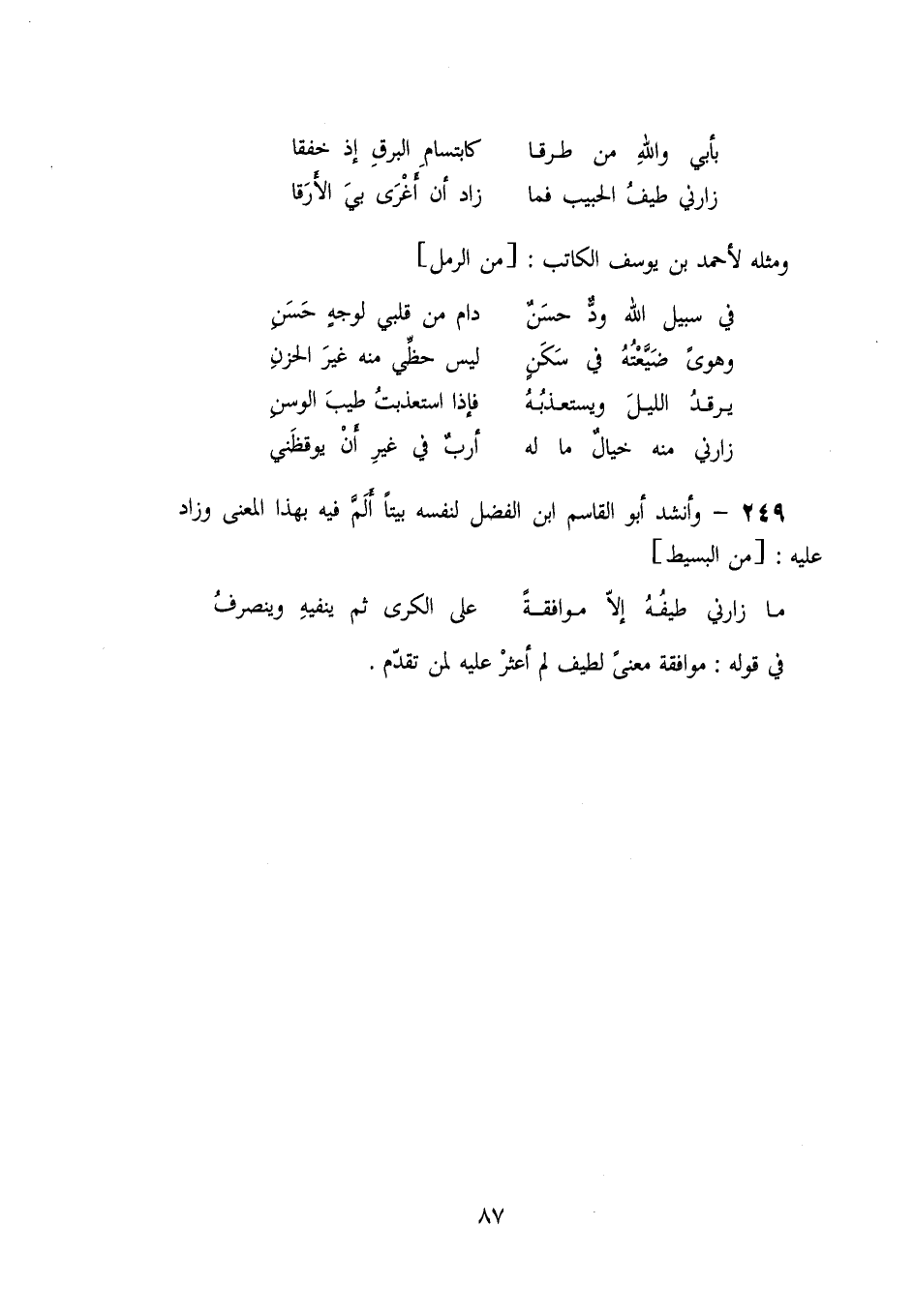 249- وأنشد أبو القاسم ابن الفضل لنفسه بيتا ألمّ فيه بهذا المعنى وزاد عليه: [من البسيط]