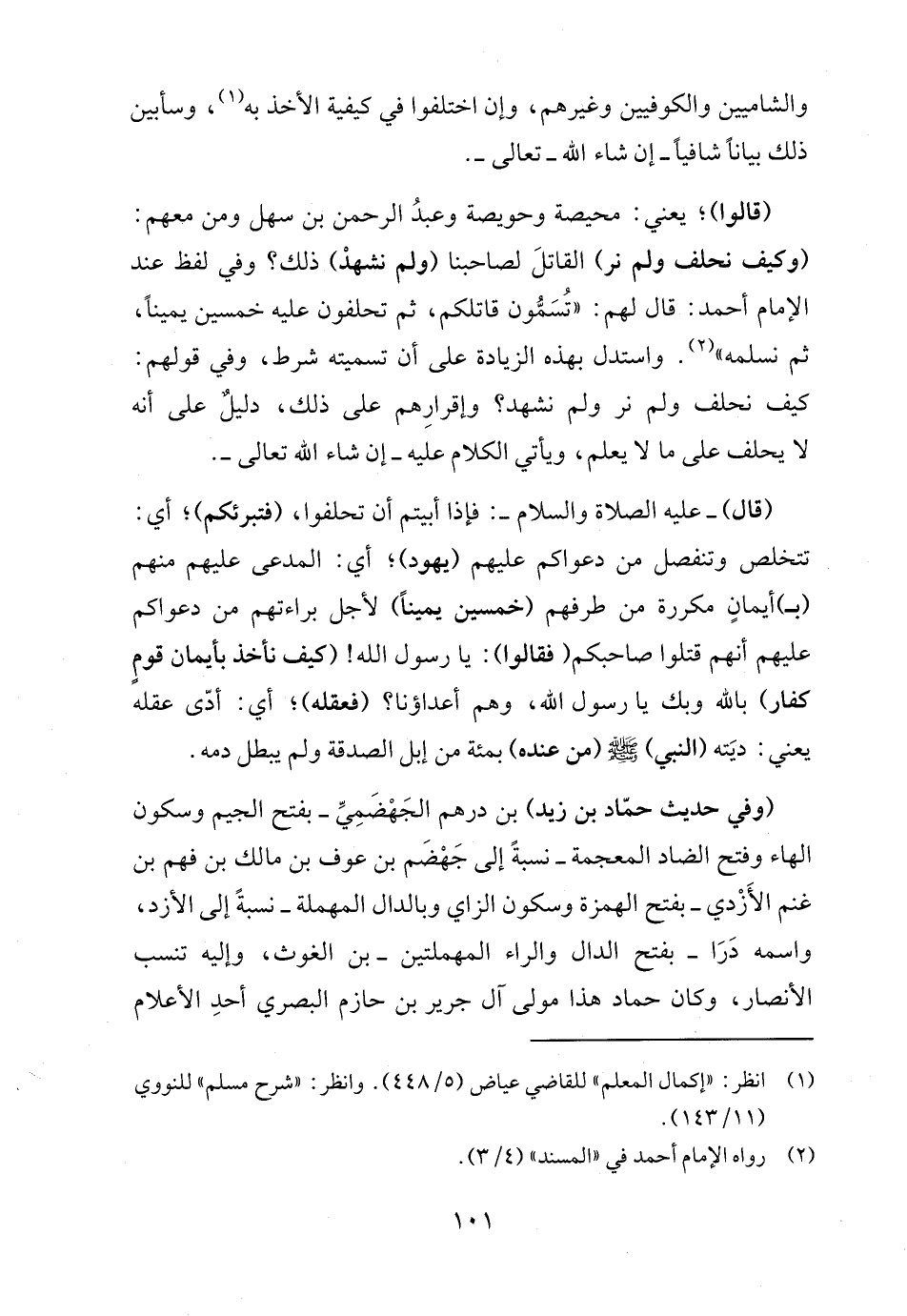 (قال) -عليه الصلاة والسلام-: فإذا أبيتم أن تحلفوا، (فتبرئكم)؛ أي: تتخلص وتنفصل من دعواكم عليهم (يهود)؛ أي: المدعى عليهم منهم (بـ) أيمانٍ مكررة من طرفهم (خمسين يمينًا) لأجل براءتهم من دعواكم عليهم أنهم قتلوا صاحبكم (فقالوا): يا رسول الله! (كيف نأخذ بأيمان قومٍ كفار) بالله وبك يا رسول الله، وهم أعداؤنا؟ (فعقله)؛ أي: أدّى عقله يعني: ديَته (النبي) - صلى الله عليه وسلم - (من عنده) بمئة من إبل الصدقة ولم يبطل دمه.