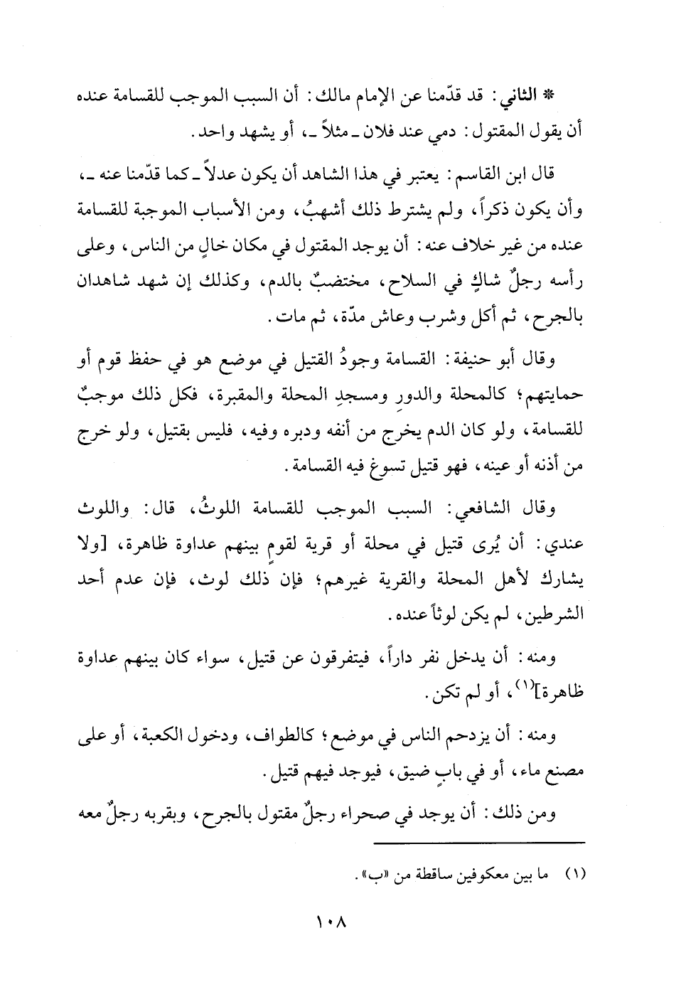 قال ابن القاسم: يعتبر في هذا الشاهد أن يكون عدلًا -كما قدّمنا عنه-، وأن يكون ذكرًا، ولم يشترط ذلك أشهبُ، ومن الأسباب الموجبة للقسامة عنده من غير خلاف عنه: أن يوجد المقتول في مكان خالٍ من الناس، وعلى رأسه رجلٌ شاكٍ في السلاح، مختضبٌ بالدم، وكذلك إن شهد شاهدان بالجرح، ثم أكل وشرب وعاش مدة، ثم مات.