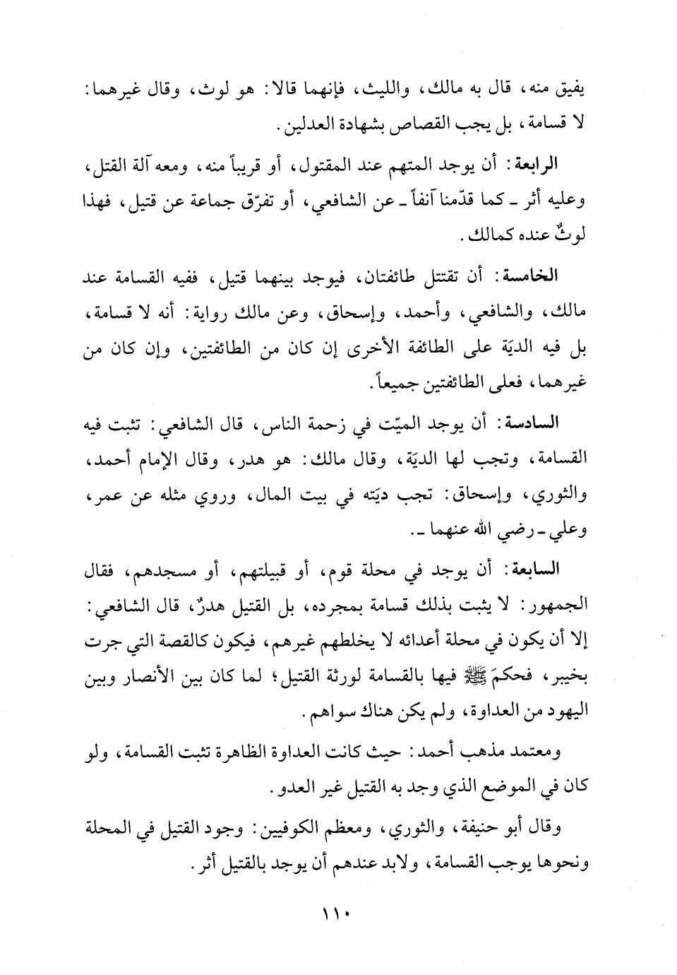 السابعة: أن يوجد في محلة قوم، أو قبيلتهم، أو مسجدهم، فقال الجمهور: لا يثبت بذلك قسامة بمجرده، بل القتيل هدرٌ، قال الشافعي: إلا أن يكون في محلة أعدائه لا يخلطهم غيرهم، فيكون كالقصة التي جرت بخيبر، فحكمَ - صلى الله عليه وسلم - فيها بالقسامة لورثة القتيل، لما كان بين الأنصار وبين اليهود من العداوة، ولم يكن هناك سواهم.
