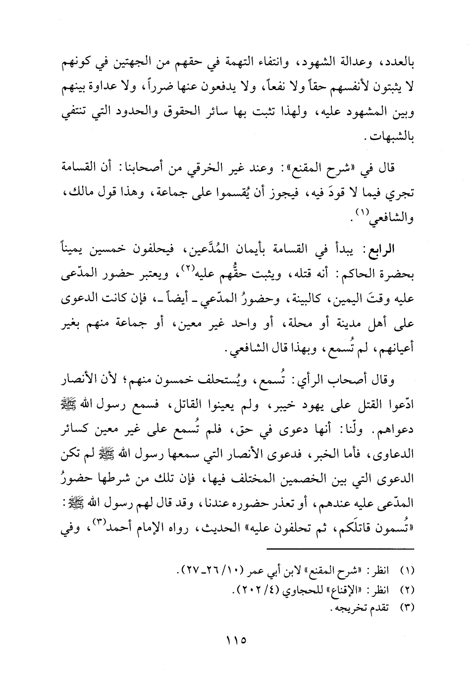 الرابع: يبدأ في القسامة بأيمان المُدَّعين، فيحلفون خمسين يمينًا بحضرة الحاكم: أنه قتله، ويثبت حقُّهم عليه (٢)، ويعتبر حضور المدّعى عليه وقتَ اليمين، كالبينة، وحضورُ المدّعي -أيضًا-، فإن كانت الدعوى على أهل مدينة أو محلة، أو واحد غير معين، أو جماعة منهم بغير أعيانهم، لم تُسمع، وبهذا قال الشافعي.