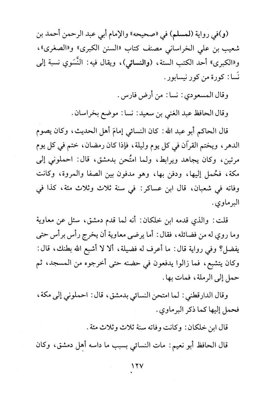 قال الحاكم أبو عبد الله: كان النسائي إمامَ أهل الحديث، وكان يصوم الدهر، ويختم القرآن في كل يوم وليلة، فإذا كان رمضان، ختم في كل يوم مرتين، وكان يجاهد ويرابط، ولما امتُحن بدمشق، قال: احملوني إلى مكة، فحُمل إليها، ودفن بها، وهو مدفون بين الصفا والمروة، وكانت وفاته في شعبان، قال ابن عساكر: في سنة ثلاث وثلاث مئة، كذا في البرماوي.