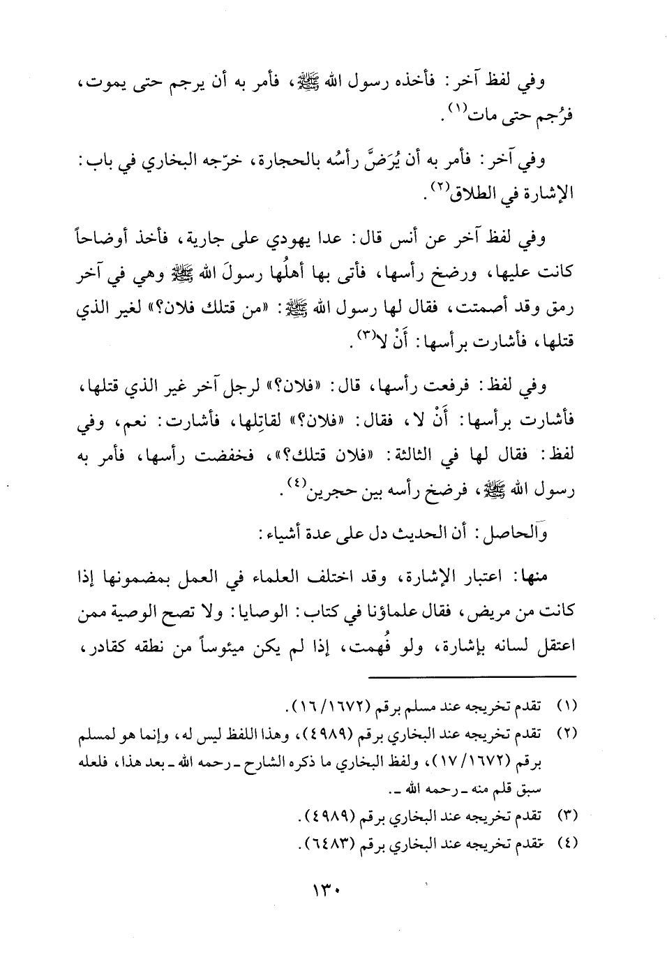 وفي آخر: فأمر به أن يُرَضَّ رأسُه بالحجارة، خرّجه البخاري في باب: الإشارة في الطلاق (٢).