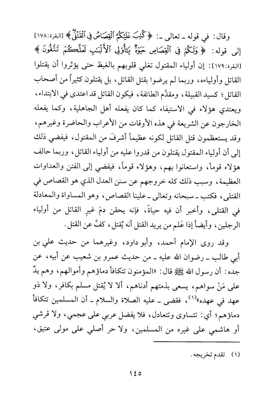 وقال: في قوله -تعالى-: {كُتِبَ عَلَيْكُمُ الْقِصَاصُ فِي الْقَتْلَى} [البقرة: ١٧٨] إلى قوله: {وَلَكُمْ فِي الْقِصَاصِ حَيَاةٌ يَاأُولِي الْأَلْبَابِ لَعَلَّكُمْ تَتَّقُونَ} [البقرة: ١٧٩]: إن أولياء المقتول تغلي قلوبهم بالغيظ حتى يؤثروا أن يقتلوا القاتل وأولياءه، وربما لم يرضوا بقتل القاتل، بل يقتلون كثيرًا من أصحاب القاتل، كسيد القبيلة، ومقدَّم الطائفة، فيكون القاتل قد اعتدى في الابتداء، ويعتدي هؤلاء في الاستيفاء كما كان يفعله أهل الجاهلية، وكما يفعله الخارجون عن الشريعة في هذه الأوقات من الأعراب والحاضرة وغيرهم، وقد يستعظمون قتل القاتل لكونه عظيمًا أشرفَ من المقتول، فيفضي ذلك إلى أن أولياء المقتول يقتلون من قدروا عليه من أولياء القاتل، وربما حالف هؤلاء قومًا، واستعانوا بهم، وهؤلاء قومًا، فيفضي إلى الفتن والعداوات العظيمة، وسبب ذلك كله خروجهم عن سنن العدل الذي هو القصاص في القتلى، فكتب -سبحانه وتعالى- علينا القصاص، وهو المساواة والمعادلة في القتلى، وأخبر أن فيه حياةً، فإنه يحقن دمَ غيرِ القاتل من أولياء الرجلين، وأيضًا إذا عَلم من يريد القتل أنه يُقتل، كفَّ عن القتل.
