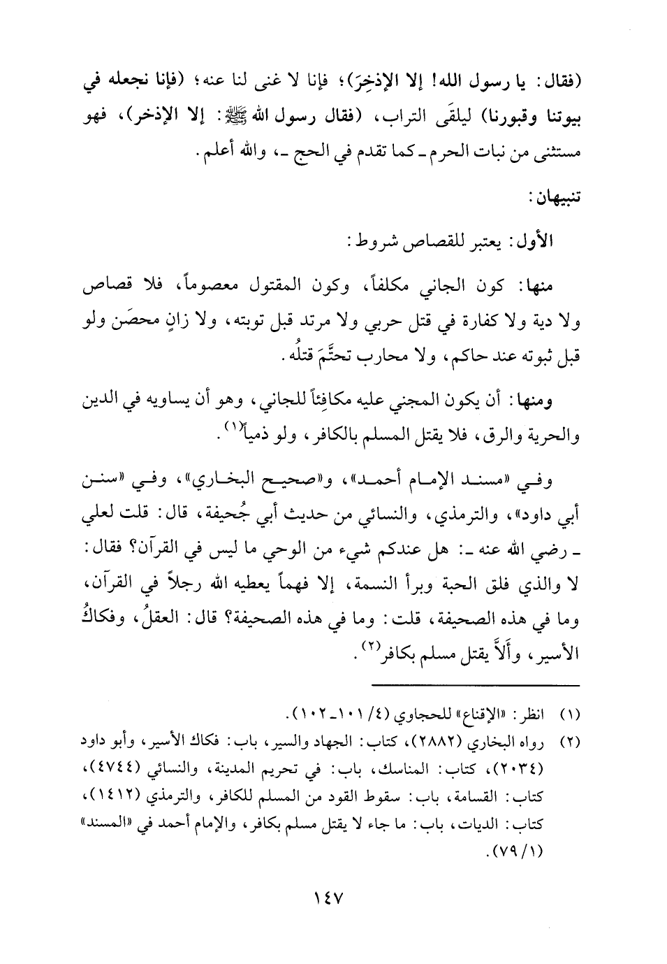 (٢) رواه البخاري (٢٨٨٢)، كتاب: الجهاد والسير، باب: فكاك الأسير، وأبو داود (٢٠٣٤)، كتاب: المناسك، باب: في تحريم المدينة، والنسائي (٤٧٤٤)، كتاب: القسامة، باب: سقوط القود من المسلم للكافر، والترمذي (١٤١٢)، كتاب: الديات، باب: ما جاء لا يقتل مسلم بكافر، والإمام أحمد في "المسند" (١/ ٧٩).