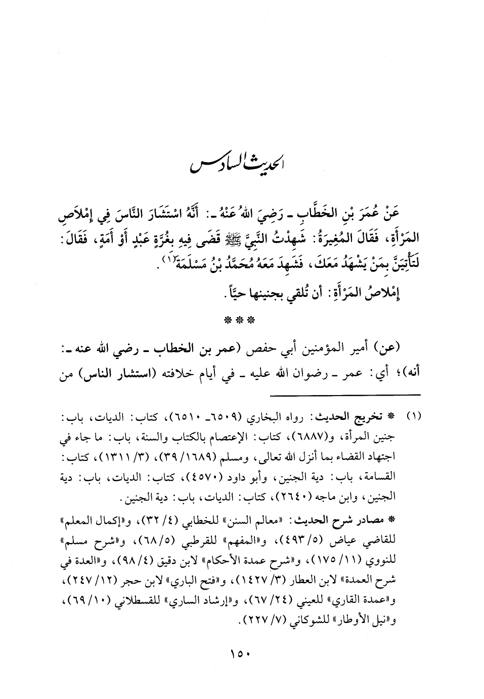 عَنْ عُمَرَ بْنِ الخَطَّابِ - رَضِيَ اللهُ عَنْهُ -: أَنّهُ اسْتَشَارَ النَّاسَ فِي إِمْلاَصِ المَرْأَةِ، فَقَالَ المُغِيرَةُ: شَهِدْتُ النَّبِيَّ - صلى الله عليه وسلم - قضَى فِيهِ بغُرَّةٍ عَبْدٍ أَوْ أَمَةٍ، فَقَالَ: لَتأْتِيَنَّ بِمَنْ يَشْهَدُ مَعَكَ، فَشَهِدَ مَعَهُ مُحَمَّدُ بْنُ مَسْلَمَةَ (١).