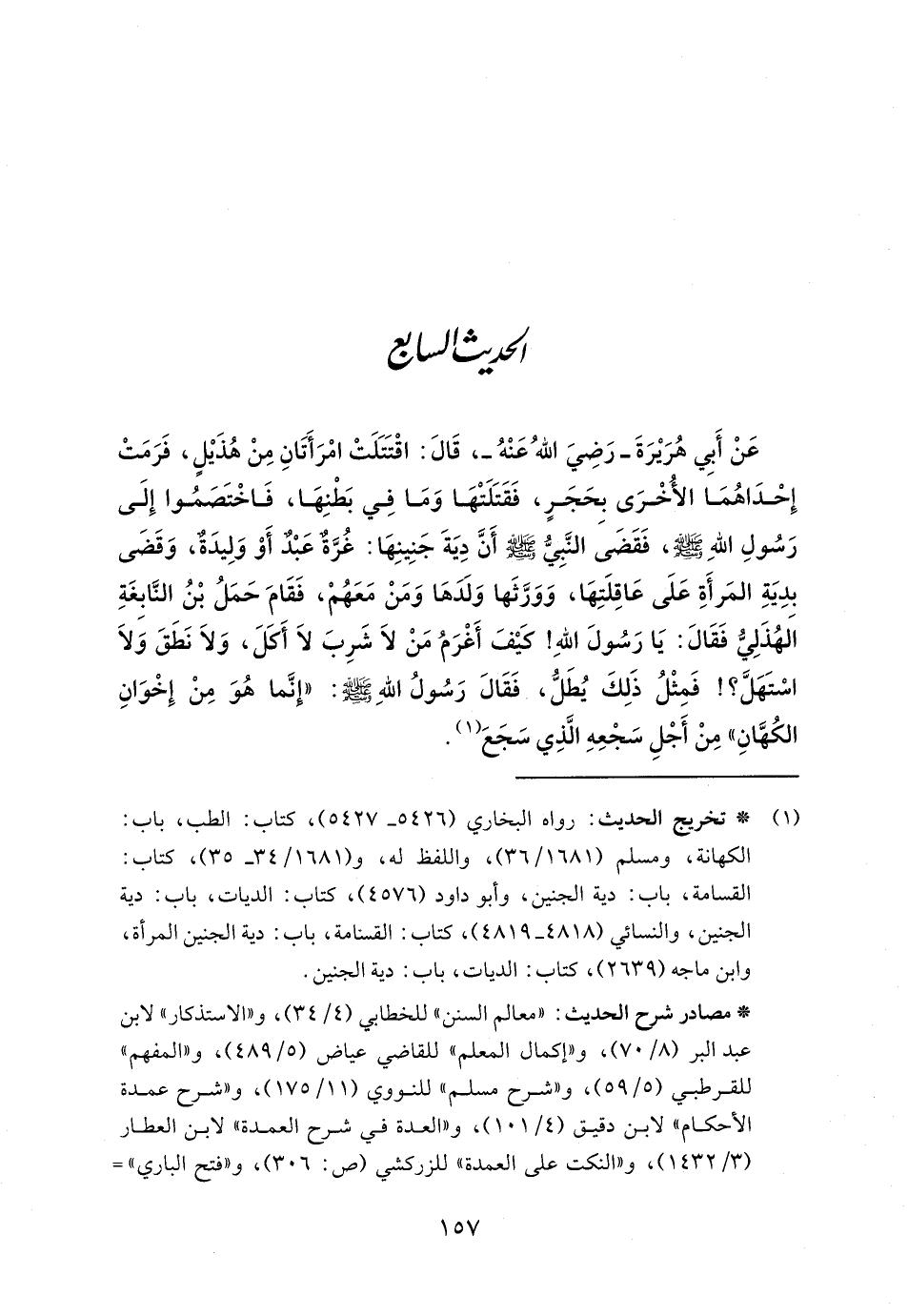 عَنْ أَبِي هُرَيْرَةَ - رَضِيَ اللهُ عَنْهُ -، قَالَ: اقْتَتَلَتْ امْرَأَتَانِ مِنْ هُذَيْلٍ، فَرَمَتْ إِحْدَاهُمَا الأُخْرَى بحَجَرٍ، فَقَتَلَتْهَا وَمَا فِي بَطْنِهَا، فَاخْتَصَمُوا إِلَى رَسُولِ اللهِ - صلى الله عليه وسلم -، فَقَضَىَ النَّبِيُّ - صلى الله عليه وسلم - أَنَّ دِيَةَ جَنِينِهَا: غُرَّةٌ عَبْدٌ أَوْ وَلِيدَةٌ، وَقَضَى بدِيَةِ المَرأَةِ عَلَى عَاقِلَتِهَا، وَوَرَّثَها وَلَدَهَا وَمَنْ مَعَهُمْ، فَقَامَ حَمَلُ بْنُ النَّابِغَةِ الهُذَلِيُّ فَقَالَ: يَا رَسُولَ اللهِ! كَيْفَ أَغْرَمُ مَنْ لاَ شَرِبَ لاَ أَكلَ، وَلاَ نَطَقَ وَلاَ اسْتَهَلَّ؟! فَمِتْلُ ذَلِكَ يُطَلُّ، فَقَالَ رَسُولُ اللهِ - صلى الله عليه وسلم -: "إنَّما هُوَ مِنْ إِخْوَانِ الكُهَّانِ" مِنْ أَجْلِ سَجْعِهِ الَّذِي سَجَعَ (١).