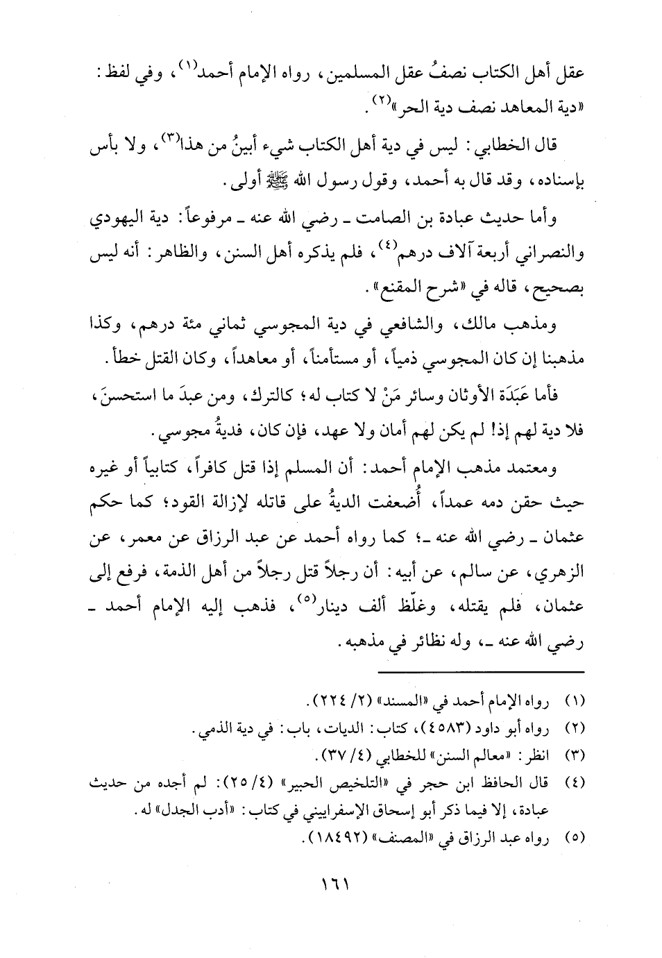 ومعتمد مذهب الإمام أحمد: أن المسلم إذا قتل كافرًا، كتابيًا أو غيره حيث حقن دمه عمدًا، أُضعفت الديةُ على قاتله لإزالة القود، كما حكم عثمان - رضي الله عنه -، كما رواه أحمد عن عبد الرزاق عن معمر، عن الزهري، عن سالم، عن أبيه: أن رجلًا قتل رجلًا من أهل الذمة، فرفع إلى عثمان، فلم يقتله، وغلّظ ألف دينار (٥)، فذهب إليه الإمام أحمد - رضي الله عنه -، وله نظائر في مذهبه.