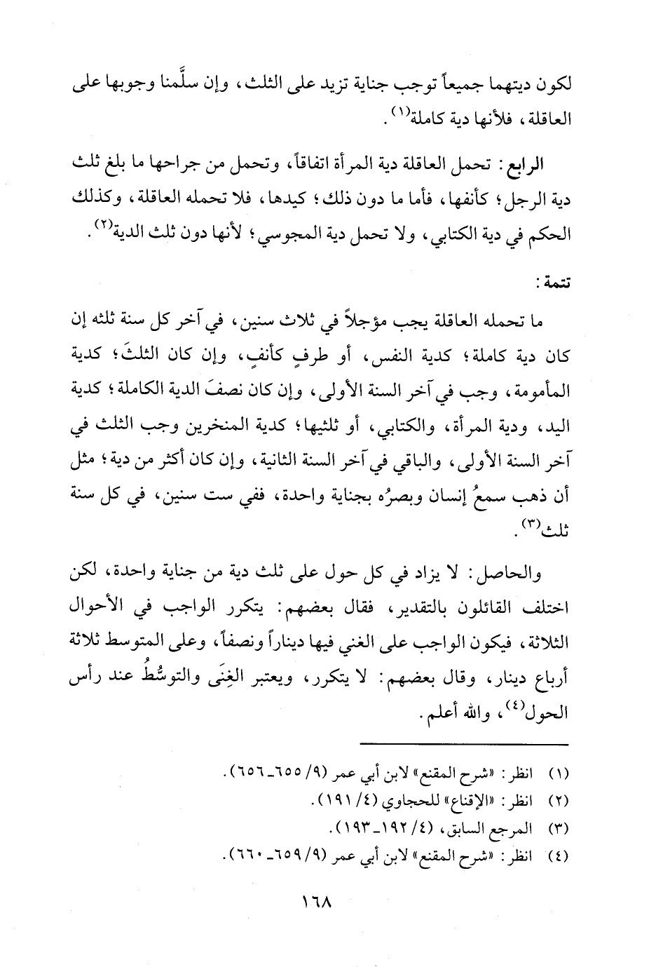 ما تحمله العاقلة يجب مؤجلًا في ثلاث سنين، في آخر كل سنة ثلثه إن كان دية كاملة، كدية النفس، أو طرفٍ كأنفٍ، وإن كان الثلثَ، كدية المأمومة، وجب في آخر السنة الأولى، وإن كان نصفَ الدية الكاملة، كدية اليد، ودية المرأة، والكتابي، أو ثلثيها، كدية المنخرين وجب الثلث في آخر السنة الأولى، والباقي في آخر السنة الثانية، وإن كان أكثر من دية، مثل أن ذهب سمعُ إنسان وبصرُه بجناية واحدة، ففي ست سنين، في كل سنة ثلث (٣).
