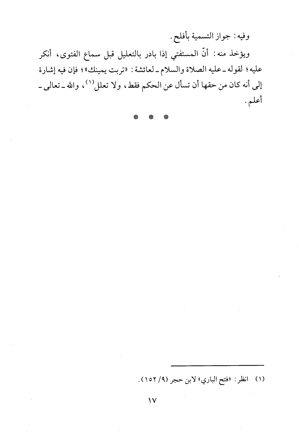 ويؤخذ منه: أنّ المستفتي إذا بادر بالتعليل قبل سماع الفتوى، أنكر عليه، لقوله -عليه الصلاة والسلام- لعائشة: "تربت يمينك"، فإن فيه إشارة إلى أنه كان من حقها أن تسأل عن الحكم فقط، ولا تعلل (١)، والله -تعالى- أعلم.