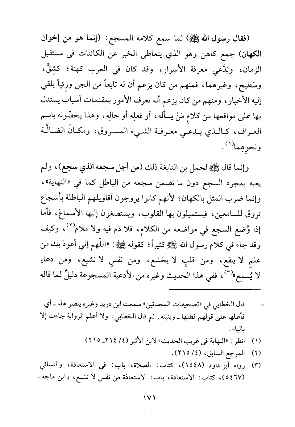 وإنما قال - صلى الله عليه وسلم - لحمل بن النابغة ذلك (من أجل سجعه الذي سجع)، ولم يعبه بمجرد السجع دون ما تضمن سجعه من الباطل كما في "النهاية"، وإنما ضرب المثل بالكهان؛ لأنهم كانوا يروجون أقاويلهم الباطلة بأسجاع تروق للسامعين، فيستميلون بها القلوب، ويستصغون إليها الأسماعَ، فأما إذا وُضع السجع في مواضعه من الكلام، فلا ذم فيه ولا ملام (٢)، وكيف وقد جاء في كلام رسول الله - صلى الله عليه وسلم - كثيرًا، كقوله - صلى الله عليه وسلم -: "اللهم إني أعوذ بك من علمٍ لا ينفع، ومن قلبٍ لا يخشع، ومن نفسٍ لا تشبع، ومن دعاءٍ لا يُسمع" (٣)، ففي هذا الحديث وغيره من الأدعية المسجوعة دليلٌ لما قاله