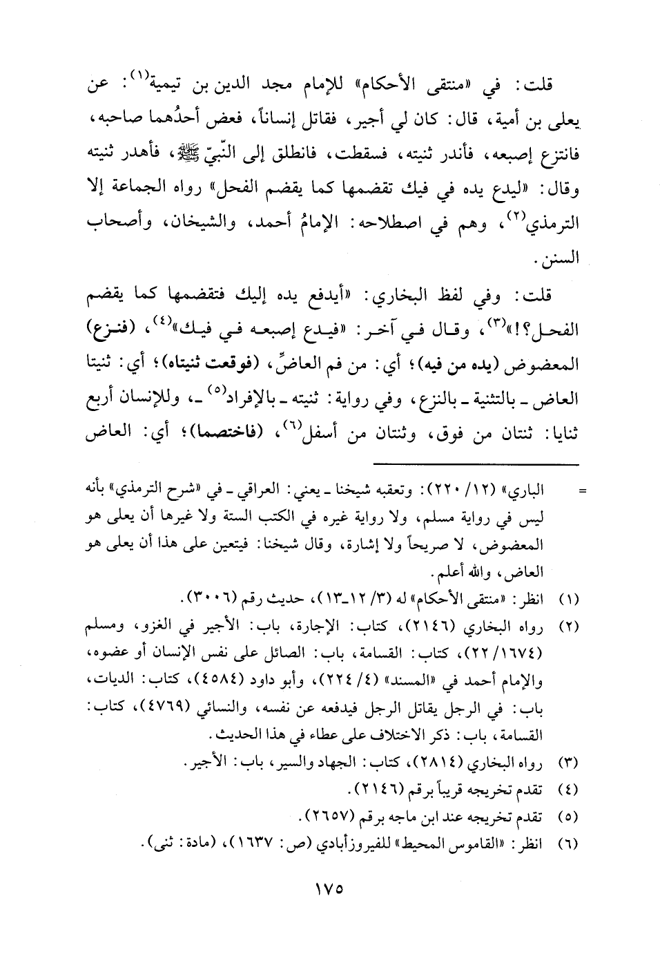 قلت: في "منتقى الأحكام" للإمام مجد الدين بن تيمية (١): عن يعلى بن أمية، قال: كان لي أجير، فقاتل إنسانًا، فعض أحدُهما صاحبه، فانتزع إصبعه، فأندر ثنيته، فسقطت، فانطلق إلى النّبيّ - صلى الله عليه وسلم -، فأهدر ثنيته وقال: "ليدع يده في فيك تقضمها كما يقضم الفحل" رواه الجماعة إلا الترمذي (٢)، وهم في اصطلاحه: الإمامُ أحمد، والشيخان، وأصحاب السنن.