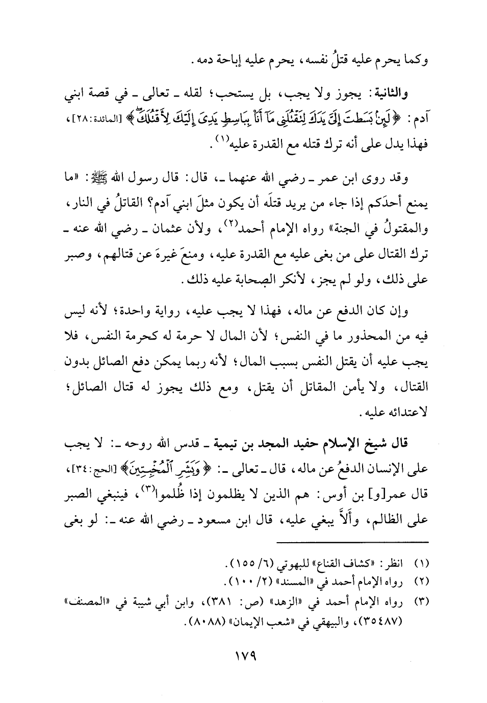 قال شيخ الإسلام حفيد المجد بن تيمية -قدس الله روحه-: لا يجب على الإنسان الدفعُ عن ماله، قال -تعالى-: {وَبَشِّرِ الْمُخْبِتِينَ} [الحج: ٣٤]، قال عمر [و] بن أوس: هم الذين لا يظلمون إذا ظُلموا (٣)، فينبغي الصبر على الظالم، وأَلَّا يبغي عليه، قال ابن مسعود - رضي الله عنه -: لو بغى
