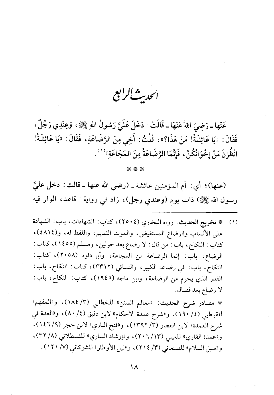 عَنْها - رَضِيَ اللهُ عَنْهَا - قَالَتْ: دَخَلَ عَلَيَّ رَسُولُ اللهِ - صلى الله عليه وسلم -، وَعِنْدِي رَجُلٌ، فَقَالَ: "يَا عَائِشَةُ؟ مَنْ هَذَا؟ "، قُلْتُ: أَخِي مِنَ الرَّضَاعَةِ، فَقَالَ: "يَا عَائِشَةُ! انْظُرْنَ مَنْ إِخْوَانكُنَّ، فَإنَّمَا الرَّضَاعَةُ مِنَ المَجَاعَةِ" (١).