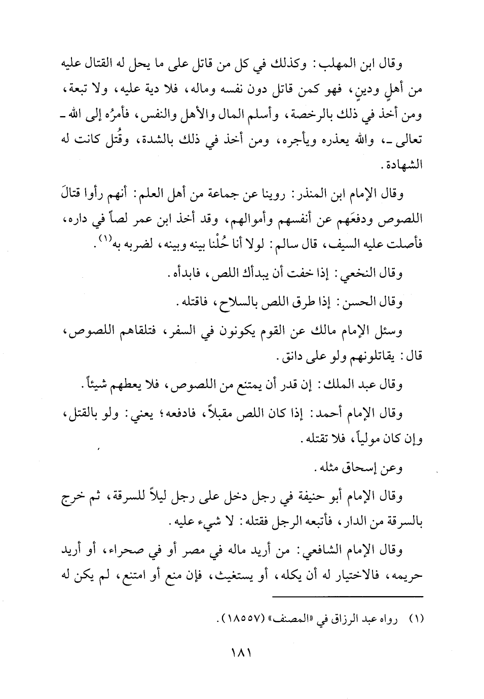 وقال الإمام ابن المنذر: روينا عن جماعة من أهل العلم: أنهم رأوا قتالَ اللصوص ودفعَهم عن أنفسهم وأموالهم، وقد أخذ ابن عمر لصًا في داره، فأصلت عليه السيف، قال سالم: لولا أنا حُلْنا بينه وبينه، لضربه به (١).