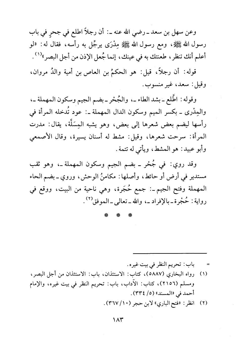 (١) رواه البخاري (٥٨٨٧)، كتاب: الاستئذان، باب: الاستئذان من أجل البصر، ومسلم (٢١٥٦)، كتاب: الآداب، باب: تحريم النظر في بيت غيره، والإمام أحمد في "المسند" (٥/ ٣٣٤).