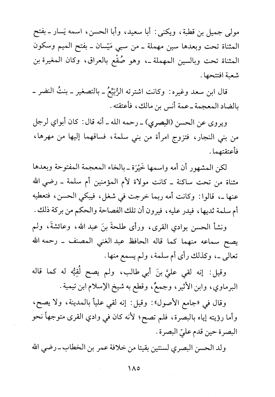 ونشأ الحسن بوادي القرى، ورأى طلحةَ بنَ عبد الله، وعائشةَ، ولم يصح سماعه منهما كما قاله الحافظ عبد الغني المصنف -رحمه الله تعالى-، وكذلك رأى أم سلمة، ولم يسمع منها.