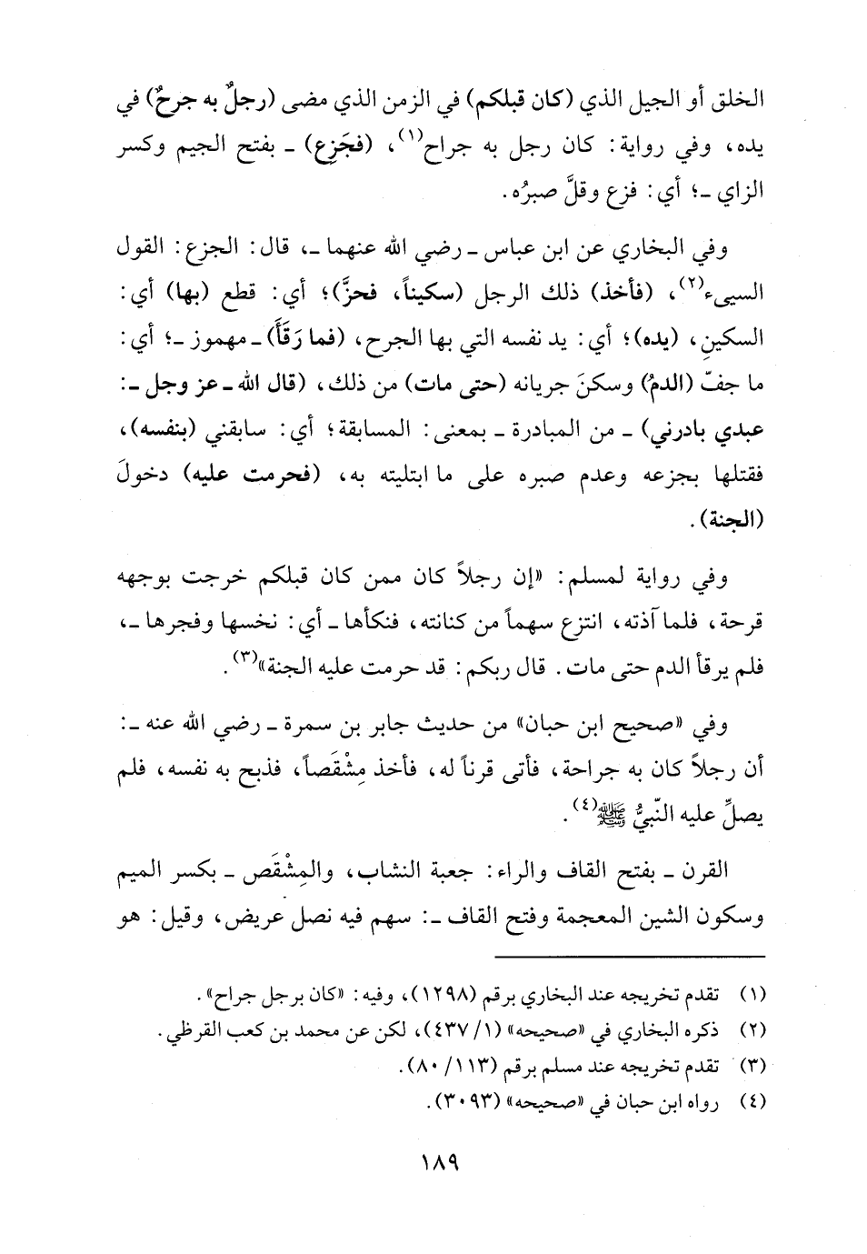 وفي البخاري عن ابن عباس -رضي الله عنهما-، قال: الجزع: القول السيئ (٢)، (فأخذ) ذلك الرجل (سكينًا، فحزَّ)؛ أي: قطع (بها) أي: السكينِ، (يده)؛ أي: يد نفسه التي بها الجرح، (فما رَقَأَ) -مهموز-؛ أي: ما جفّ (الدمُ) وسكنَ جريانه (حتى مات) من ذلك، (قال الله -عز وجل-: عبدي بادرني) -من المبادرة- بمعنى: المسابقة؛ أي: سابقني (بنفسه)، فقتلها بجزعه وعدم صبره على ما ابتليته به، (فحرمت عليه) دخول (الجنة).
