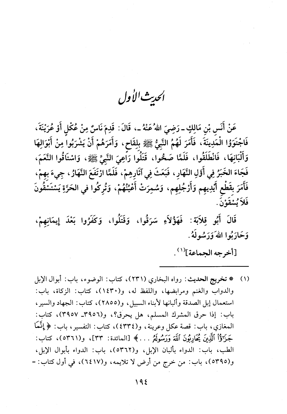 رواه البخاري (٢٣١)، كتاب: الوضوء، باب: أبوال الإبل والدواب والغنم ومرابضها، واللفظ له، و (١٤٣٠)، كتاب: الزكاة، باب: استعمال إبل الصدقة وألبانها لأبناء السبيل، و (٢٨٥٥)، كتاب: الجهاد والسير، باب: إذا حرق المشرك المسلم، هل يحرق؟، و (٣٩٥٦ - ٣٩٥٧)، كتاب: المغازي، باب: قصة عكل وعرينة، و (٤٣٣٤)، كتاب: التفسير، باب: {إِنَّمَا جَزَاءُ الَّذِينَ يُحَارِبُونَ اللَّهَ وَرَسُولَهُ. . . .} [المائدة: ٣٣]، و (٥٣٦١)، كتاب: الطب، باب: الدواء بألبان الإبل، و (٥٣٦٢)، باب: الدواء بأبوال الإبل، و (٥٣٩٥)، باب: من خرج من أرض لا تلايمه، و (٦٤١٧)، في أول كتاب: =