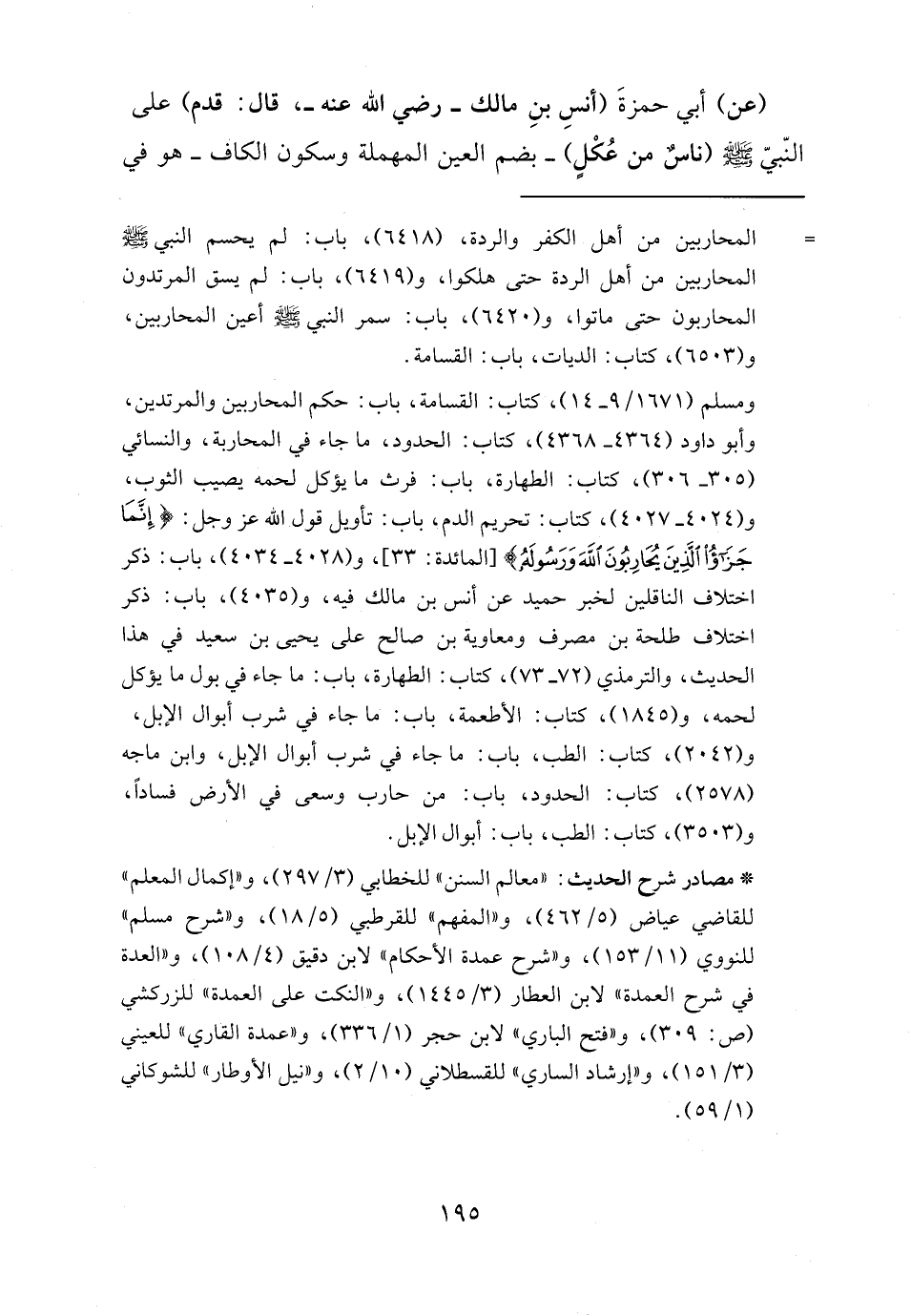 ومسلم (١٦٧١/ ٩ - ١٤)، كتاب: القسامة، باب: حكم المحاربين والمرتدين، وأبو داود (٤٣٦٤ - ٤٣٦٨)، كتاب: الحدود، ما جاء في المحاربة، والنسائي (٣٠٥ - ٣٠٦)، كتاب: الطهارة، باب: فرث ما يؤكل لحمه يصيب الثوب، و (٤٠٢٤ - ٤٠٢٧)، كتاب: تحريم الدم، باب: تأويل قول الله -عز وجل-: {إِنَّمَا جَزَاءُ الَّذِينَ يُحَارِبُونَ اللَّهَ وَرَسُولَهُ} [المائدة: ٣٣]، و (٤٠٢٨ - ٤٠٣٤)، باب: ذكر اختلاف الناقلين لخبر حميد عن أنس بن مالك فيه، و (٤٠٣٥)، باب: ذكر اختلاف طلحة بن مصرف ومعاوية بن صالح على يحيى بن سعيد في هذا الحديث، والترمذي (٧٢ - ٧٣)، كتاب: الطهارة، باب: ما جاء في بول ما يؤكل لحمه، و (١٨٤٥)، كتاب: الأطعمة، باب: ما جاء في شرب أبوال الإبل، و (٢٠٤٢)، كتاب: الطب، باب: ما جاء في شرب أبوال الإبل، وابن ماجه (٢٥٧٨)، كتاب: الحدود، باب: من حارب وسعى في الأرض فسادًا، و (٣٥٠٣)، كتاب: الطب، باب: أبوال الإبل.