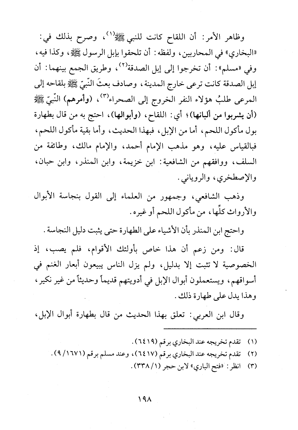 وظاهر الأمر: أن اللقاح كانت للنبي - صلى الله عليه وسلم - (١)، وصرح بذلك في: "البخاري" في المحاربين، ولفظه: أن تلحقوا بإبل الرسول - صلى الله عليه وسلم -، وكذا فيه، وفي "مسلم": أن تخرجوا إلى إبل الصدقة (٢)، وطريق الجمع بينهما: أن إبل الصدقة كانت ترعى خارج المدينة، وصادف بعثَ النّبيّ - صلى الله عليه وسلم - بلقاحه إلى المرعى طلبُ هؤلاء النفر الخروج إلى الصحراء (٣)، (وأمرهم) النّبيّ - صلى الله عليه وسلم - (أن يشربوا من ألبانها)؛ أي: اللقاح، (وأبوالها)، احتج به من قال بطهارة بول مأكول اللحم، أما من الإبل، فبهذا الحديث، وأما بقية مأكول اللحم، فبالقياس عليه، وهو مذهب الإمام أحمد، والإمام مالك، وطائفة من السلف، ووافقهم من الشافعية: ابن خزيمة، وابن المنذر، وابن حبان، والإصطخري، والروياني.