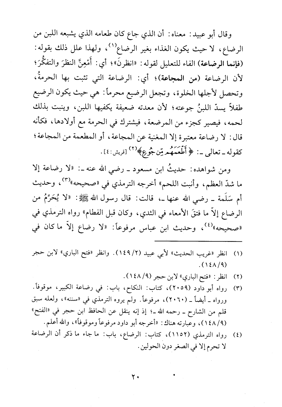 وقال أبو عبيد: معناه: أن الذي جاع كان طعامه الذي يشبعه اللبن من الرضاع، لا حيث يكون الغذاء بغير الرضاع (١)، ولهذا علل ذلك بقوله: (فإنما الرضاعة) الفاء للتعليل لقوله: "انظرنَ"؛ أي: أَمْعِنَّ النظرَ والتفكُّرَ؛ لأن الرضاعة (من المجاعة)؛ أي: الرضاعة التي تثبت بها الحرمةُ، وتحصل لأجلها الخلوة، وتجعل الرضيع محرمًا: هي حيث يكون الرضيع طفلًا يسدّ اللبنُ جوعته؛ لأن معدته ضعيفة يكفيها اللبن، وينبت بذلك لحمه، فيصير كجزء من المرضعة، فيشترك في الحرمة مع أولادها، فكأنه قال: لا رضاعة معتبرة إلا المغنية عن المجاعة، أو المطعمة من المجاعة، كقوله -تعالى-: {أَطْعَمَهُمْ مِنْ جُوعٍ} (٢) [قريش: ٤].