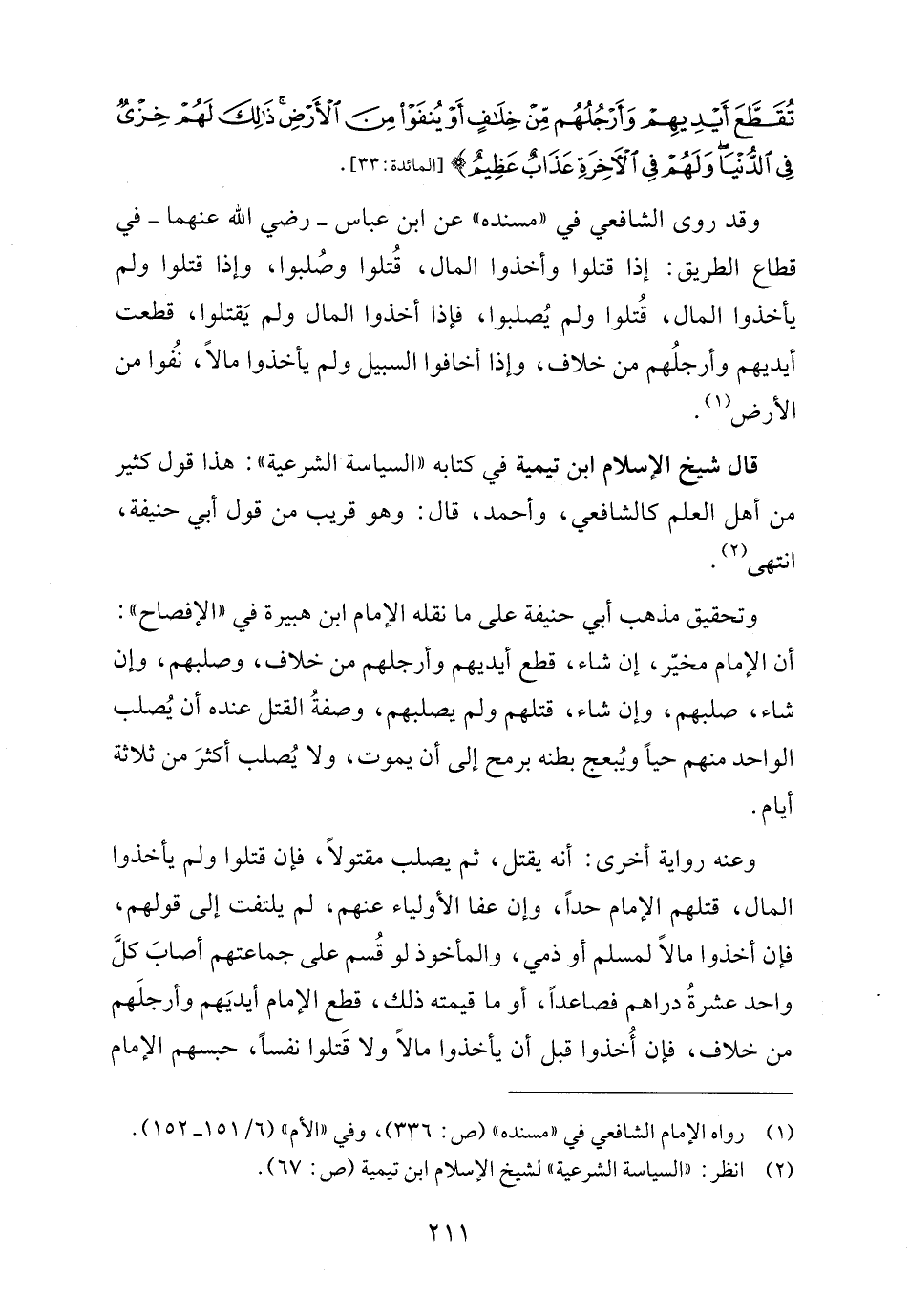 وقد روى الشافعي في "مسنده" عن ابن عباس -رضي الله عنهما- في قطاع الطريق: إذا قتلوا وأخذوا المال، قُتلوا وصُلبوا، وإذا قتلوا ولم يأخذوا المال، قُتلوا ولم يُصلبوا، فإذا أخذوا المال ولم يَقتلوا، قطعت أيديهم وأرجلُهم من خلف، وإذا أخافوا السبيل ولم يأخذوا مالًا، نُفوا من الأرض (١).