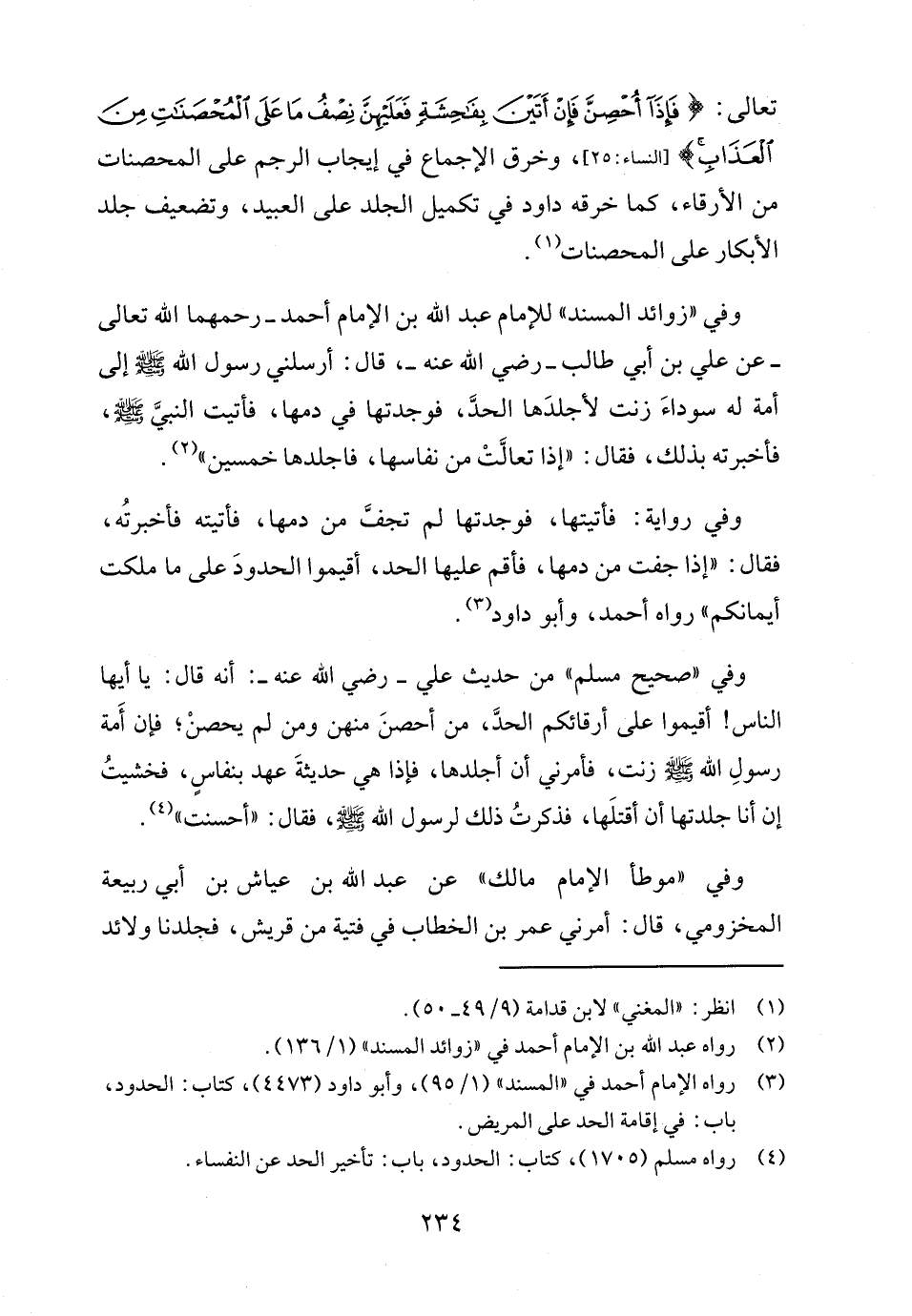 وفي "زوائد المسند" للإمام عبد الله بن الإمام أحمد -رحمهما الله تعالى- عن علي بن أبي طالب - رضي الله عنه -، قال: أرسلني رسول الله - صلى الله عليه وسلم - إلى أمة له سوداءَ زنت لأجلدَها الحدَّ، فوجدتها في دمها، فأتيت النبيَّ - صلى الله عليه وسلم -، فأخبرته بذلك، فقال: "إذا تعالَّتْ من نفاسها، فاجلدها خمسين" (٢).