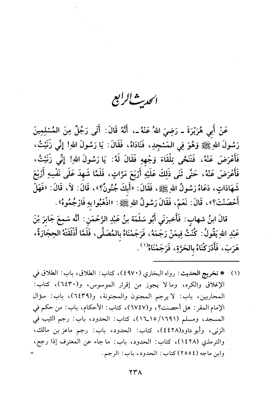 عَنْ أَبِي هُرَيْرَةَ - رضي الله عنه -، أَنّهُ قَالَ: أَتَى رَجُلٌ مِنَ المُسْلِمِينَ رَسُولَ اللهِ - صلى الله عليه وسلم - وَهُوَ فِي المَسْجِدِ، فَنَادَاهُ، فَقَالَ: يَا رَسُولَ اللهِ! إنِّي زَنَيْتُ، فَأَعرَضَ عَنْهُ، فَتنَحَّى تِلْقَاءَ وَجْهِهِ فَقَالَ لَهُ: يَا رَسُولَ اللهِ! إِنِّي زَنَيْتُ، فَأعرَضَ عَنْهُ، حَتَّى ثنَى ذَلِكَ عَلَيْهِ أَربَعَ مَرَّاتٍ، فَلَمَّا شَهِدَ عَلَى نَفْسِهِ أَربَعَ شَهادَاتٍ، دَعَاهُ رَسُولُ اللهِ - صلى الله عليه وسلم -، فَقَالَ: "أَبكَ جُنُون؟ "، قَالَ: لَا، قَالَ: "فَهلْ أَحصَنْتَ؟ "، قَالَ: نَعَم، فَقَالَ رَسُولُ اللهِ - صلى الله عليه وسلم -: "اذْهبُوا بِهِ فَارجُمُوهُ".