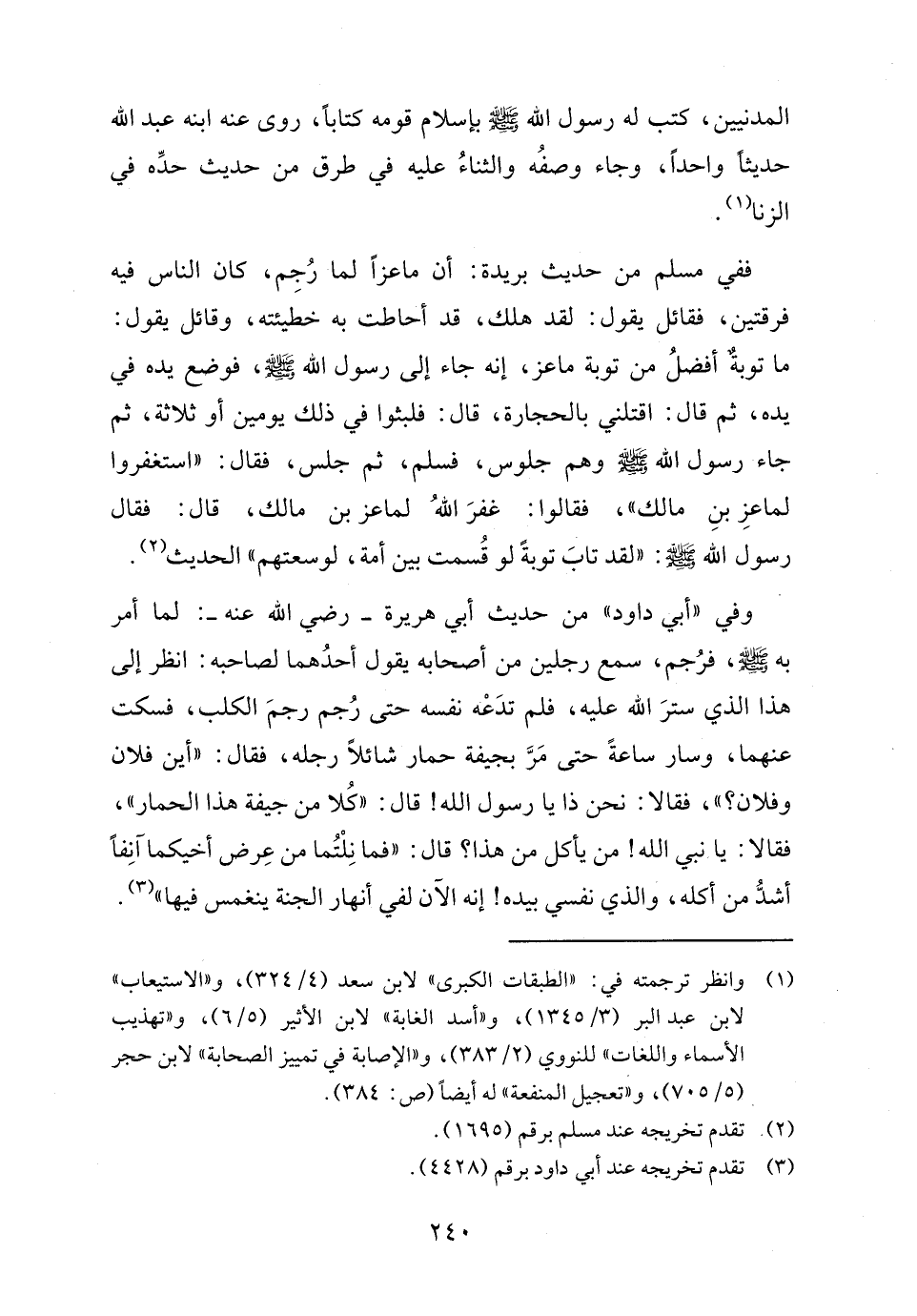 وفي "أبي داود" من حديث أبي هريرة - رضي الله عنه -: لما أمر به - صلى الله عليه وسلم -، فرُجم، سمع رجلين من أصحابه يقول أحدُهما لصاحبه: انظر إلى هذا الذي سترَ الله عليه، فلم تدَعه نفسه حتى رُجم رجمَ الكلب، فسكت عنهما، وسار ساعةً حتى مَرَّ بجيفة حمار شائلًا رجله، فقال: "أين فلان وفلان؟ "، فقالا: نحن ذا يا رسول الله! قال: "كُلا من جيفة هذا الحمار"، فقالا: يا نبي الله! من يأكل من هذا؟ قال: "فما نِلْتُما من عِرض أخيكما آنِفًا أشدُّ من أكله، والذي نفسي بيده! إنه الآن لفي أنهار الجنة ينغمس فيها" (٣).
