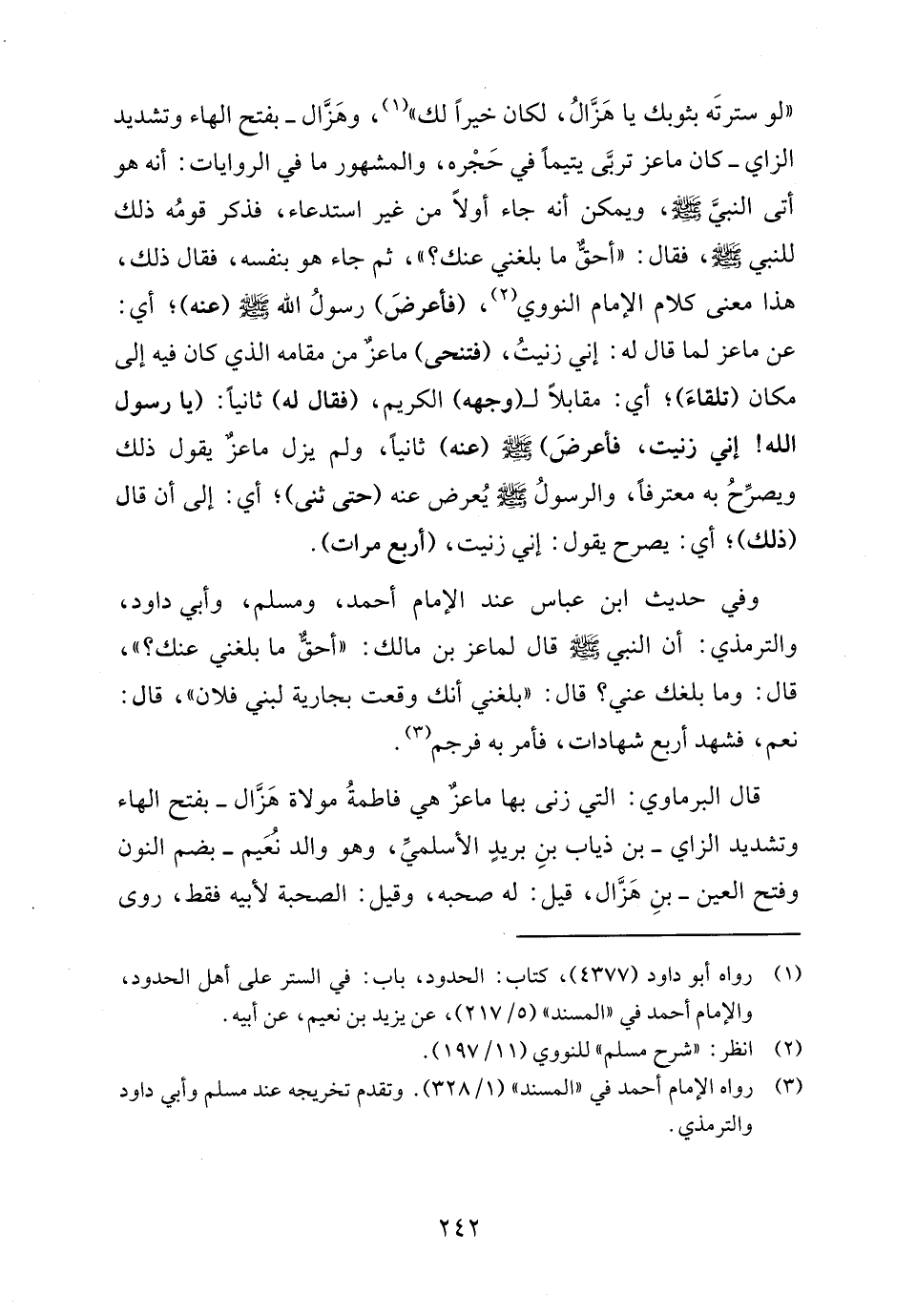 "لو سترتَه بثوبك يا هزَّالُ، لكان خيرًا لك" (١)، وهزَّال -بفتح الهاء وتشديد الزاي- كان ماعز تربَّى يتيما في حَجْره، والمشهور ما فى الروايات: أنه هو أتى النبيَّ - صلى الله عليه وسلم -، ويمكن أنه جاء أولًا من غير استدعاء، فذكر قومُه ذلك للنبي - صلى الله عليه وسلم -، فقال: "أحقٌّ ما بلغني عنك؟ "، ثم جاء هو بنفسه، فقال ذلك، هذا معنى كلام الإمام النووي (٢)، (فأعرضَ) رسولُ الله - صلى الله عليه وسلم - (عنه)؛ أي: عن ماعز لما قال له: إني زنيتُ، (فتنحى) ماعز من مقامه الذي كان فيه إلى مكان (تلقاءَ)؛ أي: مقابلًا لـ (وجهه) الكريم، (فقال له) ثانيًا: (يا رسول الله! إني زنيت، فأعرضَ) - صلى الله عليه وسلم - (عنه) ثانيًا، ولم يزل ماعزٌ يقول ذلك ويصرِّحُ به معترفًا، والرسولُ - صلى الله عليه وسلم - يُعرض عنه (حتى ثنى)؛ أي: إلى أن قال (ذلك)؛ أي: يصرح يقول: إني زنيت، (أربع مرات).