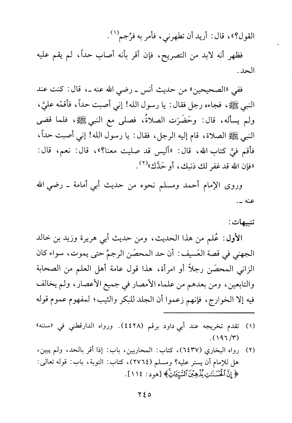 (٢) رواه البخاري (٦٤٣٧)، كتاب: المحاربين، باب: إذا أقر بالحد، ولم يبين، هل للإمام أن يستر عليه؟ ومسلم (٢٧٦٤)، كتاب: التوبة، باب: قوله تعالى: {إِنَّ الْحَسَنَاتِ يُذْهِبْنَ السَّيِّئَاتِ} [هود: ١١٤].