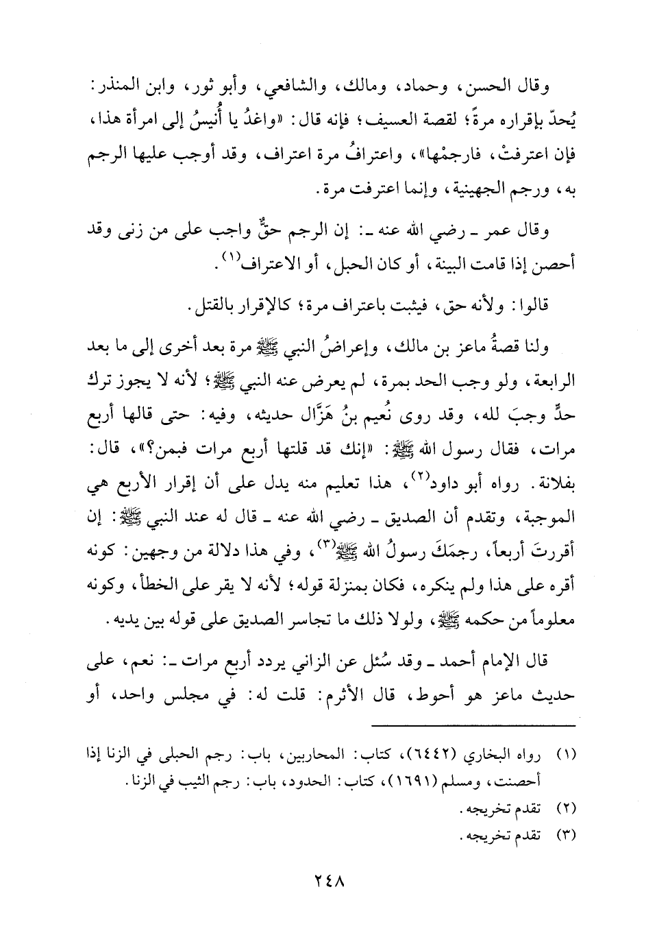 وقال الحسن، وحماد، ومالك، والشافعي، وأبو ثور، وابن المنذر: يُحدّ بإقراره مرةً، لقصة العسيف؛ فإنه قال: "واغدُ يا أُنيسُ إلى امرأة هذا، فإن اعترفتْ، فارجمها"، واعترافُ مرة اعتراف، وقد أوجب عليها الرجم به، ورجم الجهينية، وإنما اعترفت مرة.