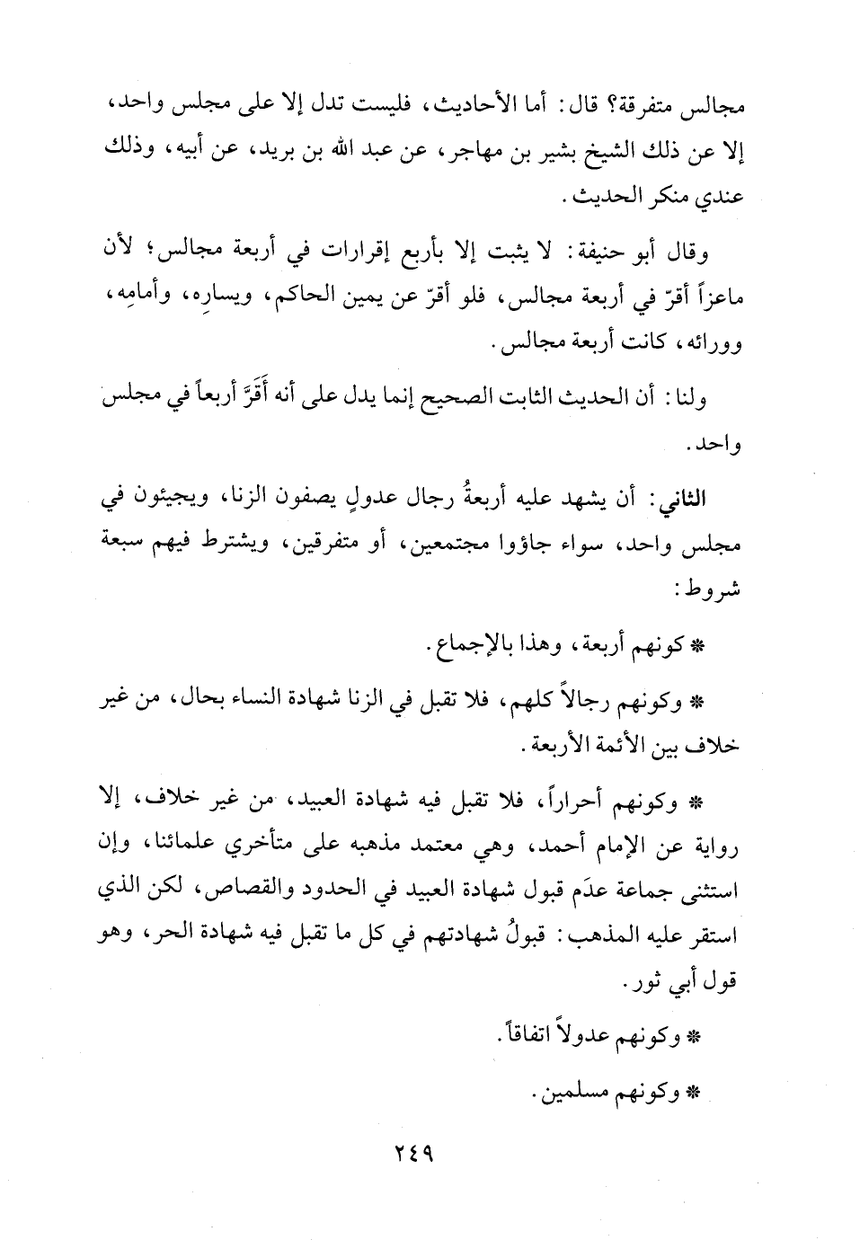 الثاني: أن يشهد عليه أربعةُ رجال عدولٍ يصفون الزنا، ويجيئون في مجلس واحد، سواء جاؤوا مجتمعين، أو متفرقين، ويشترط فيهم سبعة شروط: