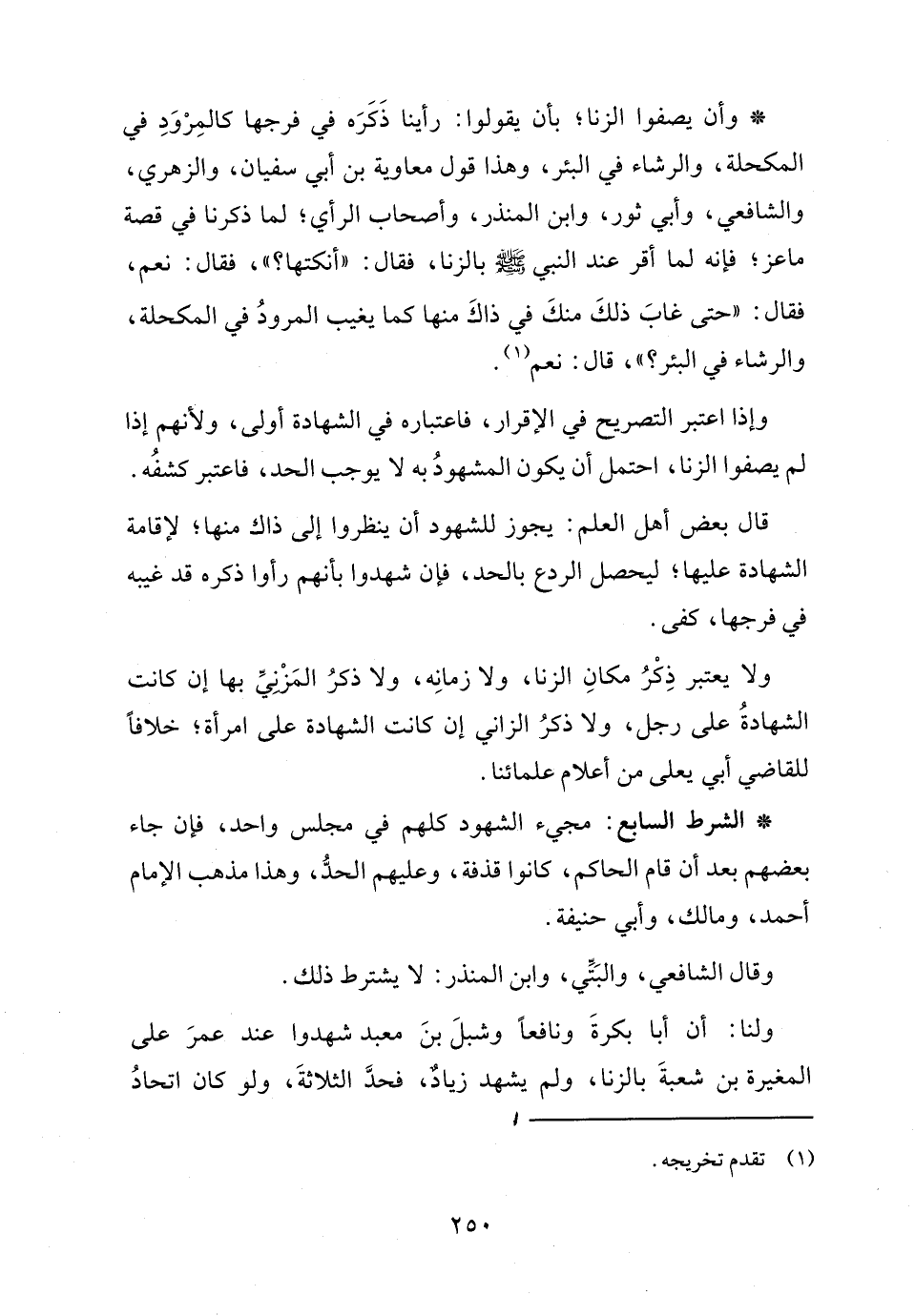 * وأن يصفوا الزنا؛ بأن يقولوا: رأينا ذَكَرَه في فرجها كالمِرْوَدِ في المكحلة، والرشاء في البئر، وهذا قول معاوية بن أبي سفيان، والزهري، والشافعي، وأبي ثور، وابن المنذر، وأصحاب الرأي؛ لما ذكرنا في قصة ماعز؛ فإنه لما أقر عند النبي - صلى الله عليه وسلم - بالزنا، فقال: "أنكتها؟ "، فقال: نعم، فقال: "حتى غابَ ذلكَ منكَ في ذاكَ منها كما يغيب المرودُ في المكحلة، والرشاء في البئر؟ "، قال: نعم (١).