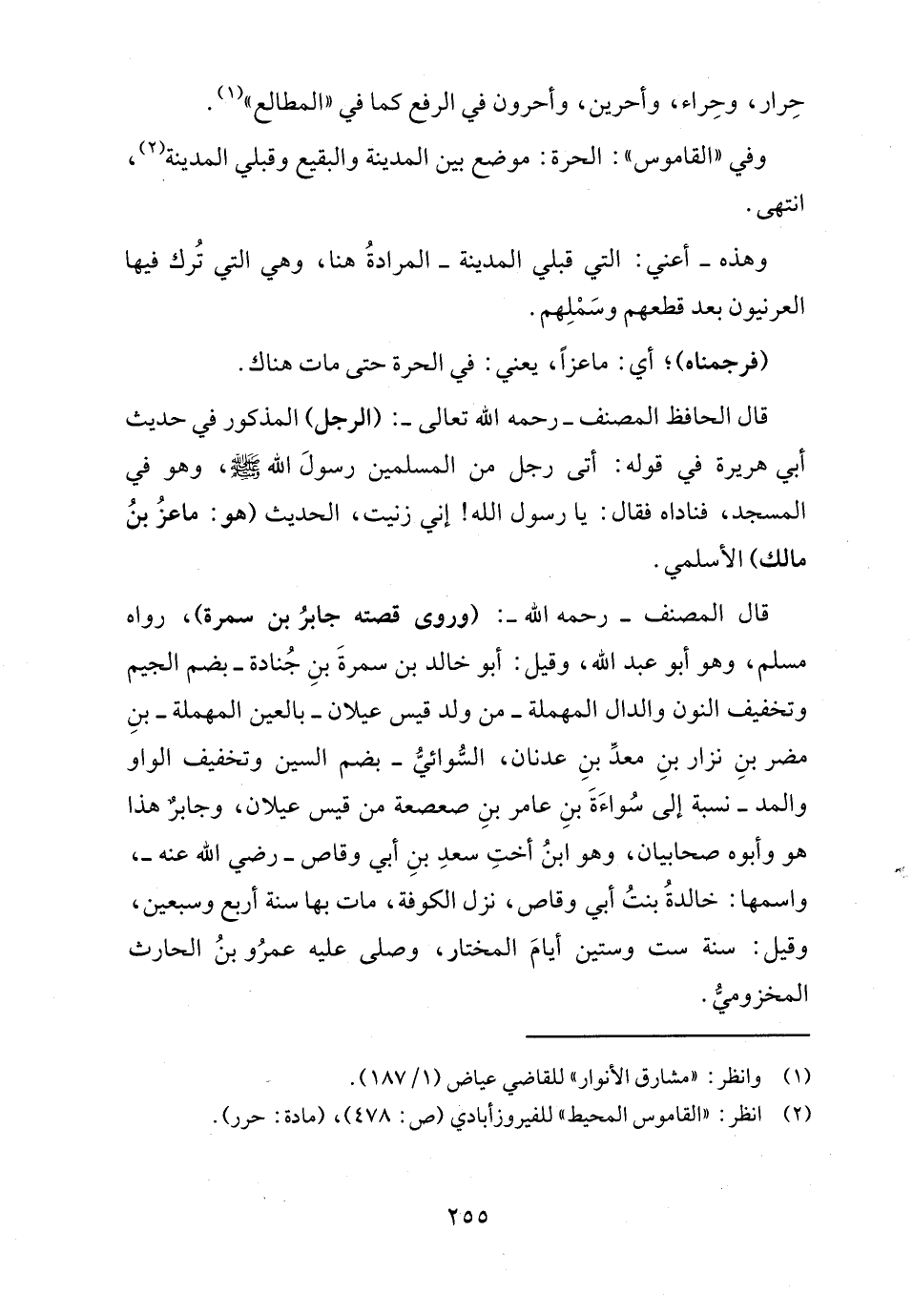 قال المصنف -رحمه الله-: (وروى قصته جابرُ بن سمرة)، رواه مسلم، وهو أبو عبد الله، وقيل: أبو خالد بن سمرةَ بنِ جُنادة -بضم الجيم وتخفيف النون والدال المهملة- من ولد قيس عيلان -بالعين المهملة- بنِ مضر بنِ نزار بنِ معدِّ بنِ عدنان، السُّوائيُّ -بضم السين وتخفيف الواو والمد- نسبة إلى سُواءَةَ بنِ عامر بنِ صعصعة من قيس عيلان، وجابرٌ هذا هو وأبوه صحابيان، وهو ابنُ أختِ سعدِ بنِ أبي وقاص - رضي الله عنه -، واسمها: خالدةُ بنتُ أبي وقاص، نزل الكوفة، مات بها سنة أربع وسبعين، وقيل: سنة ست وستين أيامَ المختار، وصلى عليه عمرُو بنُ الحارث المخزوميُّ.