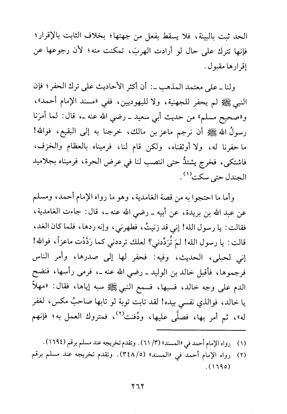 ولنا -على معتمد المذهب-: أن أكثر الأحاديث على ترك الحفر؛ فإن النبي - صلى الله عليه وسلم - لم يحفر للجهنية، ولا لليهوديين، ففي "مسند الإمام أحمد"، و"صحيح مسلم" من حديث أبي سعيد - رضي الله عنه -، قال: لما أمرَنا رسولُ الله - صلى الله عليه وسلم - أن نرجم ماعز بن مالك، خرجنا به إلى البقيع، فوالله! ما حفرنا له، ولا أوثقناه، ولكن قام لنا، فرميناه بالعظام والخزف، فاشتكى، فخرج يشتدُّ حتى انتصب لنا في عرض الحرة، فرميناه بجلاميد الجندل حتى سكت (١).