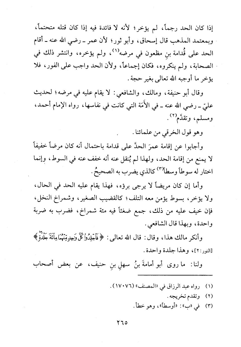 وأجابوا عن إقامة عمرَ الحدَّ على قدامة باحتمال أنه كان مرضًا خفيفًا لا يمنع من إقامة الحد، ولهذا لم يُنقل عنه أنه خفف عنه في السوط، وإنما اختار له سوطًا وسطًا (٣) كالذي يضرب به الصحيحُ.