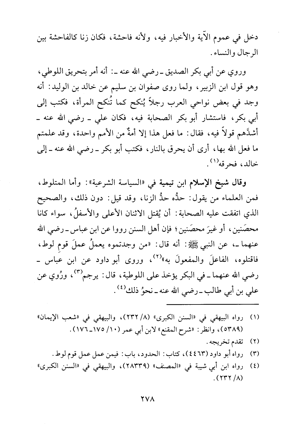 وقال شيخ الإسلام ابن تيمية في "السياسة الشرعية": وأما المتلوط، فمن العلماء من يقول: حدُّه حدُّ الزنا، وقد قيل: دون ذلك، والصحيح الذي اتفقت عليه الصحابة: أن يُقتل الاثنان الأعلى والأسفلُ، سواء كانا محصَنين، أو غيرَ محصَنين؛ فإن أهل السنن رووا عن ابن عباس -رضي الله عنهما-، عن النبي - صلى الله عليه وسلم -: أنه قال: "من وجدتموه يعملُ عملَ قومِ لوط، فاقتلوه، الفاعلَ والمفعولَ به" (٢)، وروى أبو داود عن ابن عباس -رضي الله عنهما- في البكر يؤخذ على اللوطية، قال: يرجم (٣)، ورُوي عن علي بن أبي طالب - رضي الله عنه - نحوُ ذلك (٤).