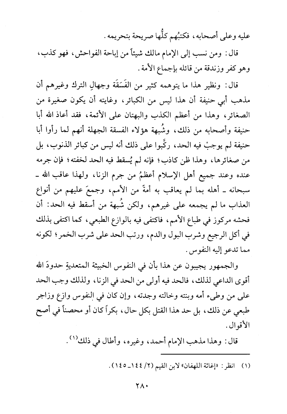 قال: ونظير هذا ما يتوهمه كثير من الفَسَقَة وجهالِ الترك وغيرهم أن مذهب أبي حنيفة أن هذا ليس من الكبائر، وغايته أن يكون صغيرة من الصغائر، وهذا من أعظم الكذب والبهتان على الأئمة، فقد أعاذ الله أبا حنيفة وأصحابه من ذلك، وشُبهة هؤلاء الفسقة الجهلة أنهم لما رأوا أبا حنيفة لم يوجبْ فيه الحد، ركَّبوا على ذلك أنه ليس من كبائر الذنوب، بل من صغائرها، وهذا ظن كاذب؛ فإنه لم يُسقط فيه الحد لخفته؛ فإن جرمه عنده وعند جميع أهل الإسلام أعظمُ من جرم الزنا، ولهذا عاقب الله -سبحانه- أهله بما لم يعاقب به أمةً من الأمم، وجمعَ عليهم من أنواع العذاب ما لم يجمعه على غيرهم، ولكن شُبهة من أسقط فيه الحد: أن فحشه مركوز في طباع الأمم، فاكتفى فيه بالوازع الطبعي، كما اكتفى بذلك في أكل الرجيع وشرب البول والدم، ورتب الحد على شرب الخمر؛ لكونه مما تدعو إليه النفوس.