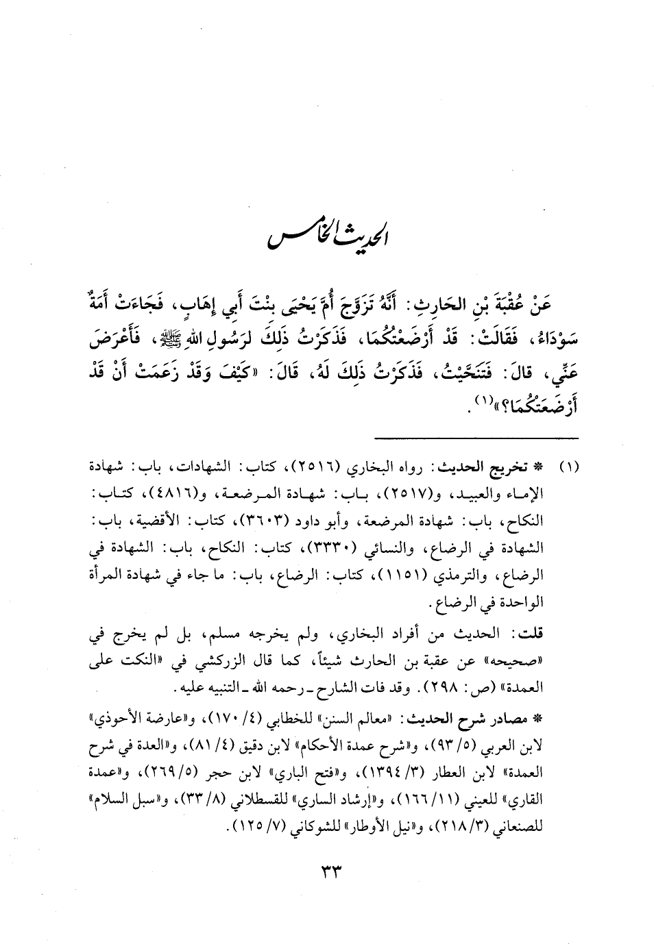 عَنْ عُقْبَةَ بْنِ الحَارِثِ: أَنَّهُ تَزَوَّجَ أُمَّ يَحْيَى بنْتَ أَبِي إِهَابٍ، فَجَاءَتْ أَمَةٌ سَوْدَاءُ، فَقَالَتْ: قَدْ أَرْضَعْتكمَا، فَذَكَرْتُ ذَلِك لرَسُولِ اللهِ - صلى الله عليه وسلم -، فَأَعْرَضَ عَنِّي، قالَ: فَتنَحَّيْتُ، فَذَكَرْتُ ذَلِكَ لَهُ، قَالَ: "كيْفَ وَقَدْ زَعَمَتْ أَنْ قَدْ أَرْضَعَتكمَا؟ " (١).