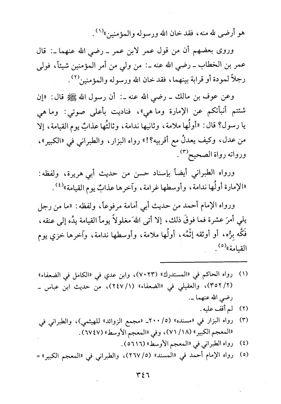 وعن عوف بن مالك - رضي الله عنه -: أن رسول الله - صلى الله عليه وسلم - قال: "إن شئتم أنبأتكم عن الإمارة وما هي"، فناديت بأعلى صوتي: وما هي يا رسول الله؟ قال: "أولُها ملامة، وثانيها ندامة، وثالثُها عذابٌ يوم القيامة، إلا من عدل، وكيف يعدلُ مع أقربيه؟! " رواه البزار، والطبراني في "الكبير"، ورواته رواة الصحيح (٣).