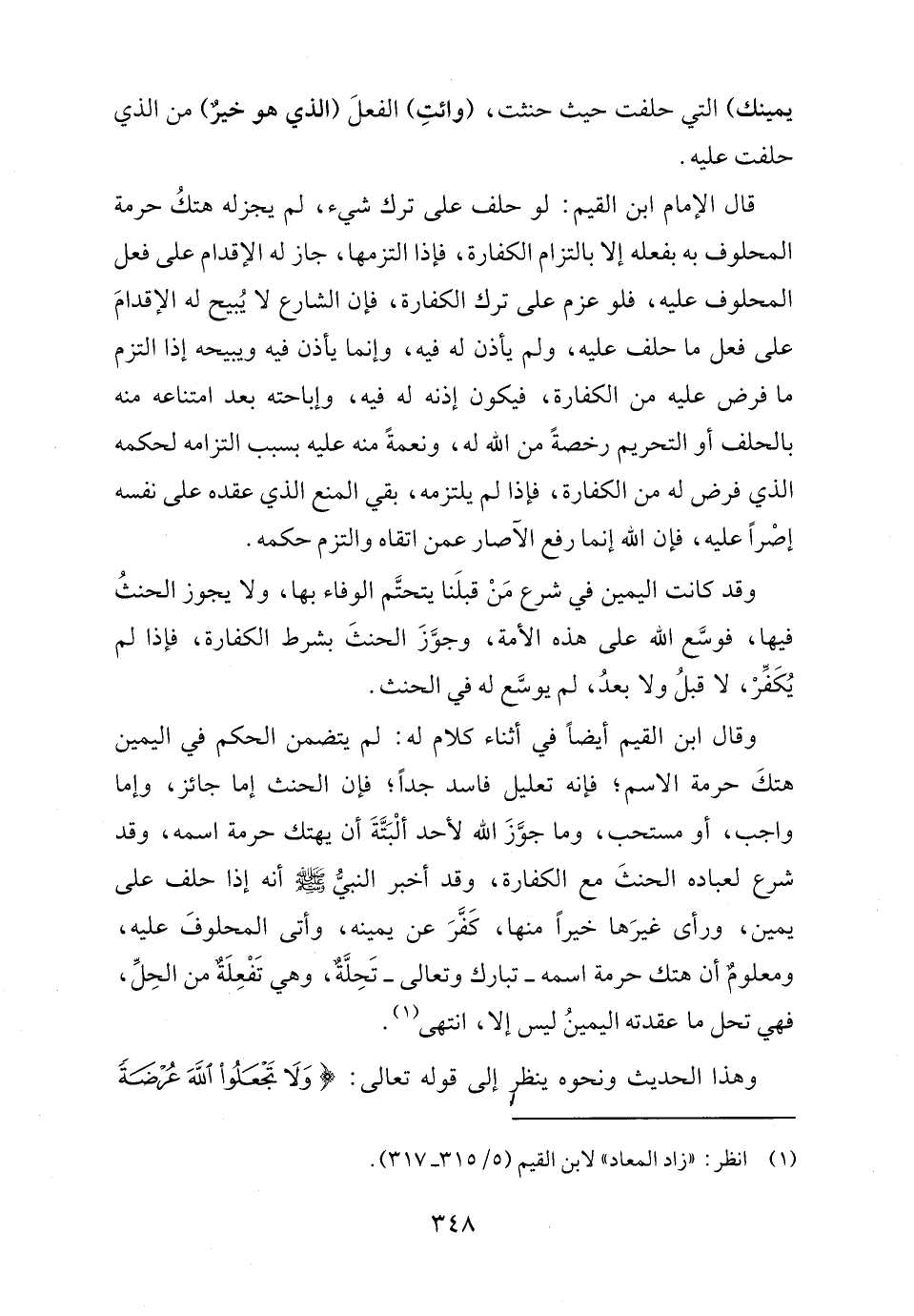 وقال ابن القيم أيضًا في أثناء كلام له: لم يتضمن الحكم في اليمين هتكَ حرمة الاسم؛ فإنه تعليل فاسد جدًا؛ فإن الحنث إما جائز، وإما واجب، أو مستحب، وما جوَّزَ الله لأحد ألْبَتَّةَ أن يهتك حرمة اسمه، وقد شرع لعباده الحنثَ مع الكفارة، وقد أخبر النبيُّ - صلى الله عليه وسلم - أنه إذا حلف على يمين، ورأى غيرَها خيرًا منها، كَفَّرَ عن يمينه، وأتى المحلوفَ عليه، ومعلومٌ أن هتك حرمة اسمه -تبارك وتعالى- تَحِلَّةٌ، وهي تَفْعِلَةٌ من الحِلِّ، فهي تحل ما عقدته اليمينُ ليس إلا، انتهى (١).