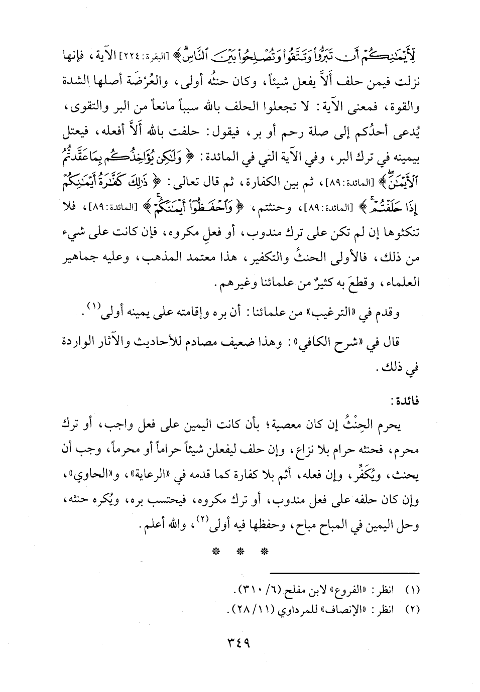 يحرم الحِنْثُ إن كان معصية؛ بأن كانت اليمين على فعل واجب، أو ترك محرم، فحنثه حرام بلا نزاع، وإن حلف ليفعلن شيئًا حرامًا أو محرمًا، وجب أن يحنث، ويُكَفِّر، وإن فعله، أثم بلا كفارة كما قدمه في "الرعاية"، و"الحاوي"، وإن كان حلفه على فعل مندوب، أو ترك مكروه، فيحتسب بره، ويُكره حنثه، وحل اليمين في المباح مباح، وحفظها فيه أولى (٢)، والله أعلم.
