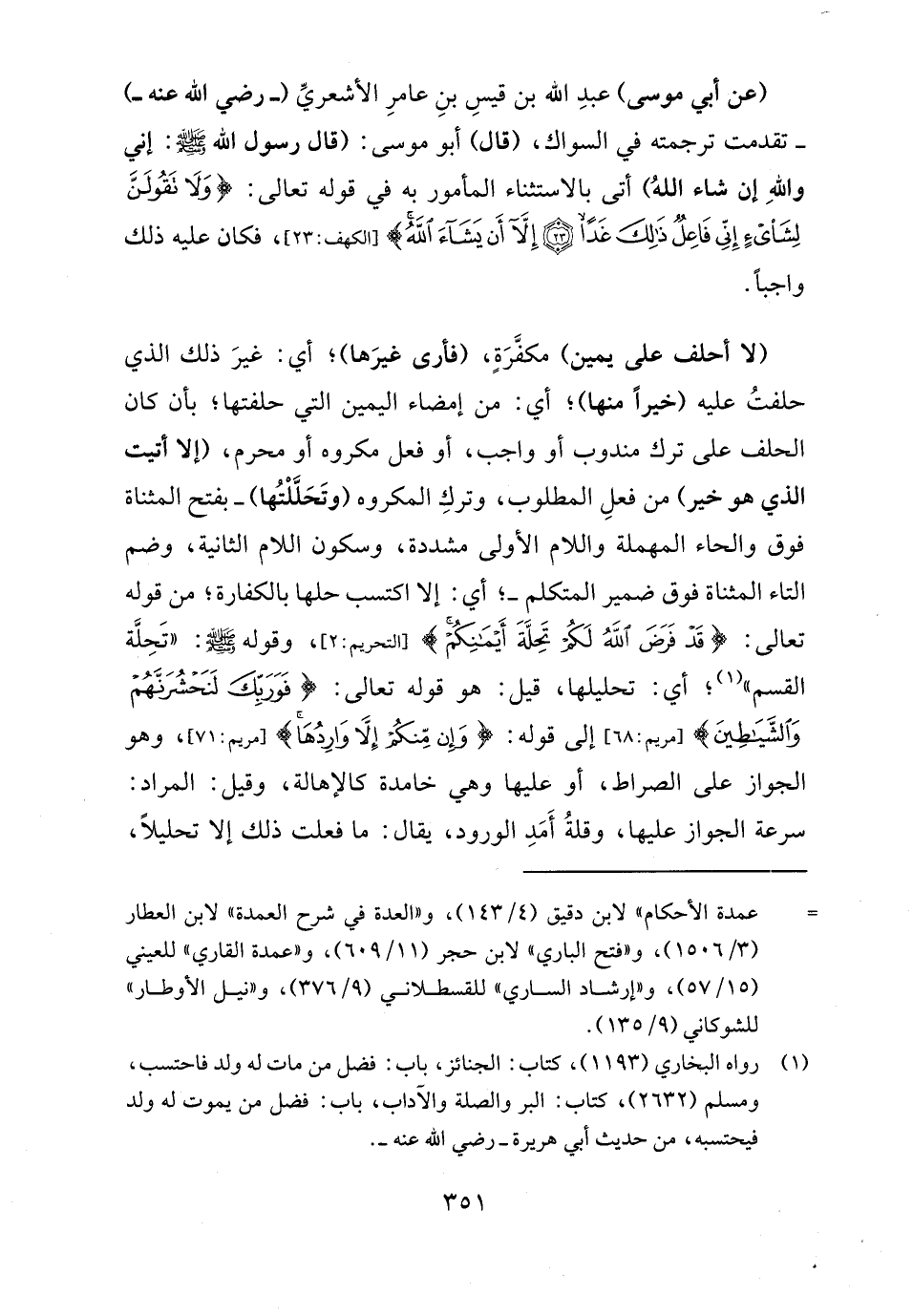 (لا أحلف على يمين) مكفَّرَةٍ، (فأرى غيرَها)؛ أي: غيرَ ذلك الذي حلفتُ عليه (خيرًا منها)؛ أي: من إمضاء اليمين التي حلفتها؛ بأن كان الحلف على ترك مندوب أو واجب، أو فعل مكروه أو محرم، (إلا أتيت الذي هو خير) من فعلِ المطلوب، وتركِ المكروه (وتَحَلَّلْتُها) -بفتح المثناة فوق والحاء المهملة واللام الأولى مشددة، وسكون اللام الثانية، وضم التاء المثناة فوق ضمير المتكلم-؛ أي: إلا اكتسب حلها بالكفارة؛ من قوله تعالى: {قَدْ فَرَضَ اللَّهُ لَكُمْ تَحِلَّةَ أَيْمَانِكُمْ} [التحريم: ٢]، وقوله - صلى الله عليه وسلم -: "تَحِلَّة القسم" (١)؛ أي: تحليلها، قيل: هو قوله تعالى: {فَوَرَبِّكَ لَنَحْشُرَنَّهُمْ وَالشَّيَاطِينَ} [مريم: ٦٨] إلى قوله: {وَإِنْ مِنْكُمْ إِلَّا وَارِدُهَا} [مريم: ٧١]، وهو الجواز على الصراط، أو عليها وهي خامدة كالإهالة، وقيل: المراد: سرعة الجواز عليها، وقلةُ أَمَدِ الورود، يقال: ما فعلت ذلك إلا تحليلًا،