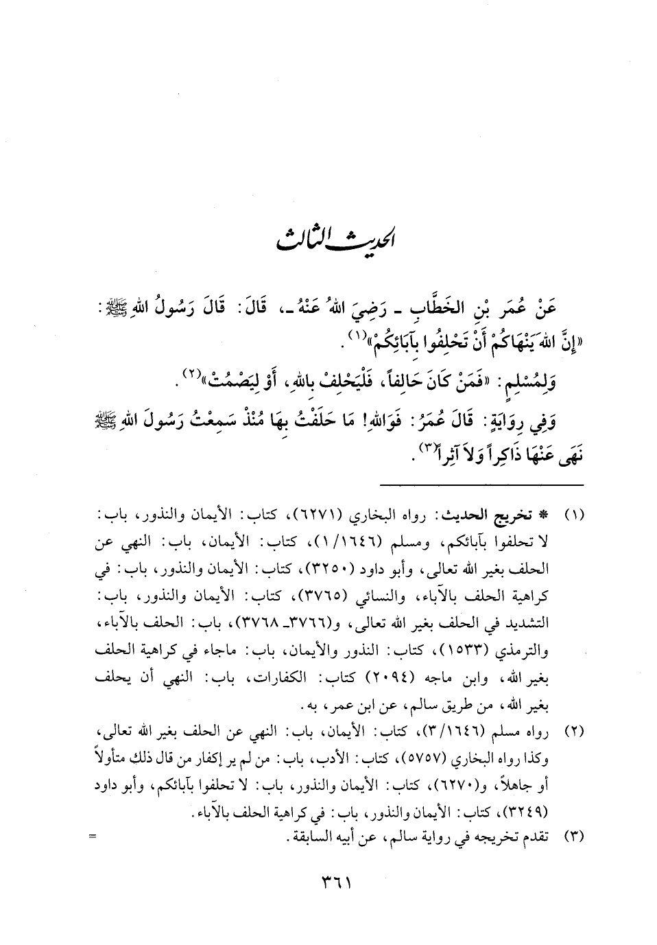 عَنْ عُمَر بْنِ الخَطَّاب - رضي الله عنه -، قَالَ: قَالَ رَسُولُ اللهِ - صلى الله عليه وسلم -: "إِنَّ اللهَ يَنْهَاكُمْ أَنْ تَحْلِفُوا بَآبَائِكُمْ" (١).