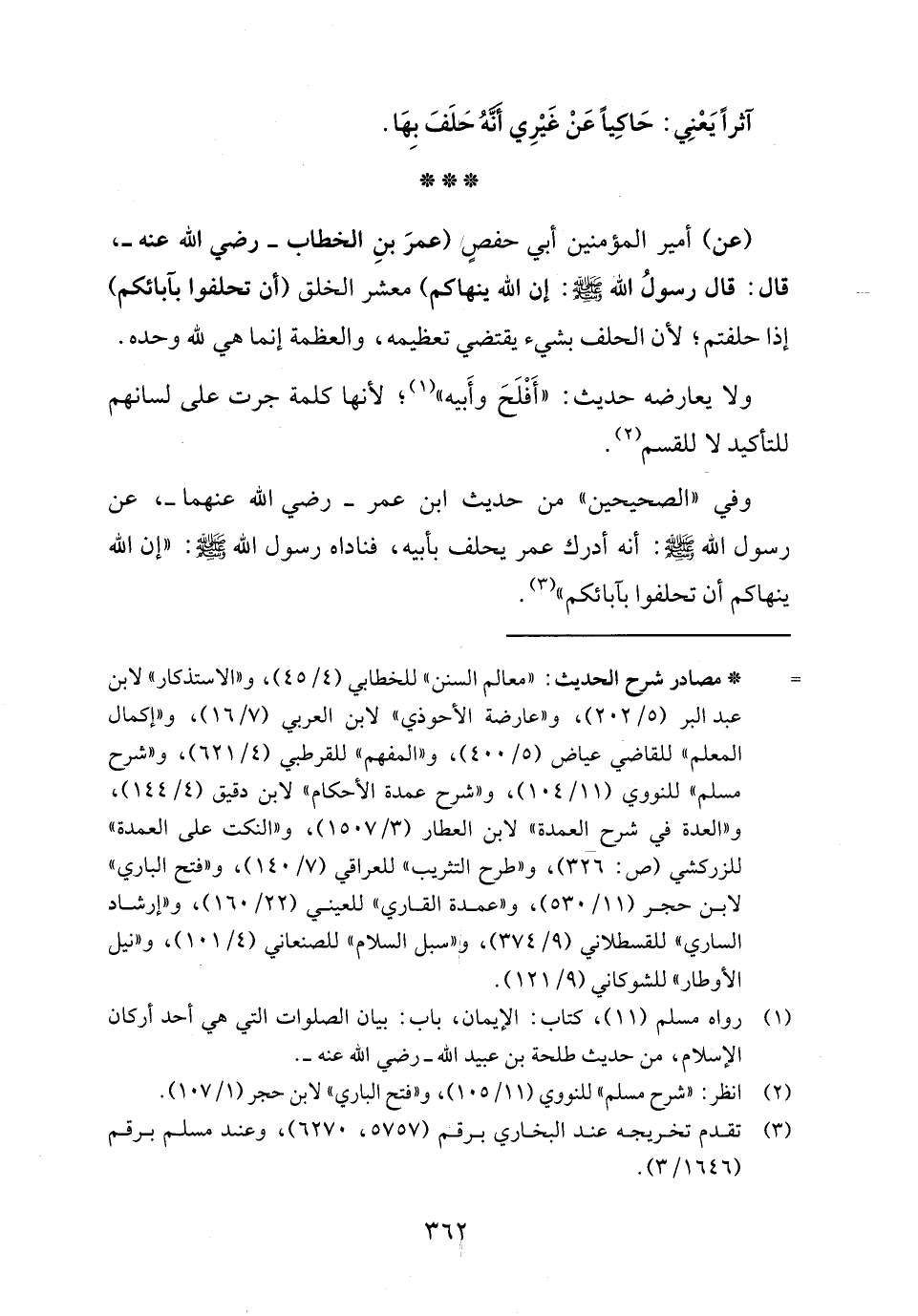 وفي "الصحيحين" من حديث ابن عمر -رضي الله عنهما-، عن رسول الله - صلى الله عليه وسلم -: أنه أدرك عمر يحلف بأبيه، فناداه رسول الله - صلى الله عليه وسلم -: "إن الله ينهاكم أن تحلفوا بآبائكم" (٣).