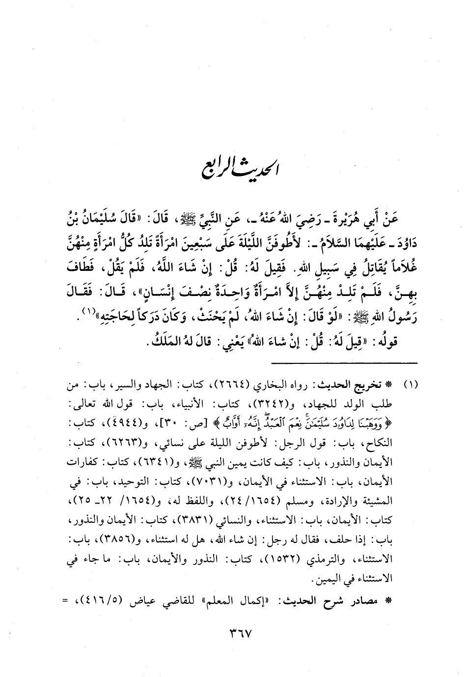 عَنْ أَبِي هُرَيْرةَ - رضي الله عنه -، عَنِ النَّبِيِّ - صلى الله عليه وسلم -، قَالَ: "قَالَ سُلَيْمَانُ بْنُ دَاوُدَ -عَلَيْهمَا السَّلَامُ-: لأَطُوفَنَّ اللَّيْلَةَ عَلَى سَبْعِينَ امْرَأَةً تَلِدُ كُلُّ امْرَأَةٍ مِنْهُنَّ غُلَامًا يُقَاتِلُ فِي سَبِيلِ اللهِ. فَقِيلَ لَهُ: قُلْ: إنْ شَاءَ اللهُ، فَلَمْ يَقُلْ، فَطَافَ بِهِنَّ، فَلَمْ تَلِدْ مِنْهُنَّ إِلَّا امْرَأَةٌ وَاحِدَةٌ نِصْفَ إنْسَانٍ"، قَالَ: فَقَالَ رَسُولُ اللهِ - صلى الله عليه وسلم -: "لَوْ قَالَ: إنْ شَاءَ اللهُ، لَمْ يَحْنَثْ، وَكَانَ دَرَكًا لِحَاجَتِهِ" (١).