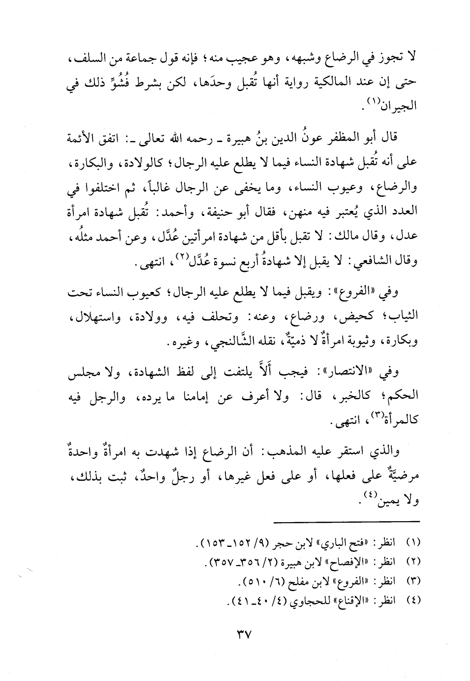 قال أبو المظفر عونُ الدين بنُ هبيرة -رحمه الله تعالى-: اتفق الأئمة على أنه تُقبل شهادة النساء فيما لا يطلع عليه الرجال، كالولادة، والبكارة، والرضاع، وعيوب النساء، وما يخفى عن الرجال غالبًا، ثم اختلفوا في العدد الذي يُعتبر فيه منهن، فقال أبو حنيفة، وأحمد: تُقبل شهادة امرأة عدل، وقال مالك: لا تقبل بأقل من شهادة امرأتين عُدَّل، وعن أحمد مثلُه، وقال الشافعي: لا يقبل إلا شهادةُ أربع نسوة عُدَّل (٢)، انتهى.