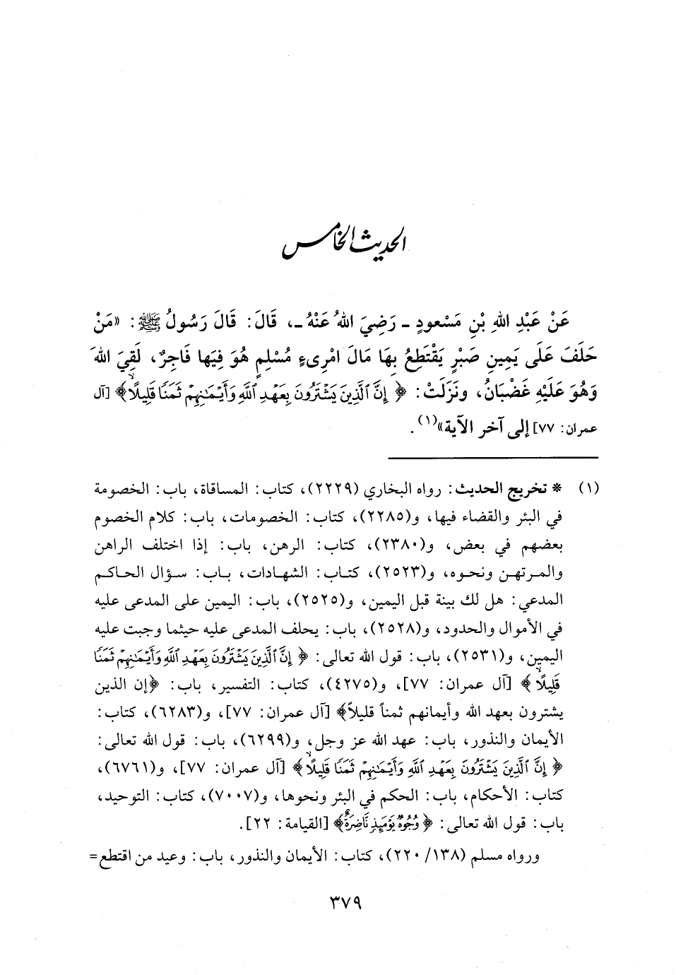 عَنْ عَبْدِ اللهِ بْنِ مَسْعودٍ - رضي الله عنه -، قَالَ: قَالَ رَسُولُ الله - صلى الله عليه وسلم -: "مَن حَلَفَ عَلَى يَمِينِ صَبْرٍ يَقْتَطعُ بهَا مَالَ امْرِىءٍ مُسْلِمٍ هُوَ فِيَها فَاجِرٌ، لَقِيَ اللهَ وَهُوَ عَلَيْهِ غَضْبَانُ، ونَزَلَتْ: {إِنَّ الَّذِينَ يَشْتَرُونَ بِعَهْدِ اللَّهِ وَأَيْمَانِهِمْ ثَمَنًا قَلِيلًا} [آل عمران: ٧٧] إلى آخر الآية" (١).